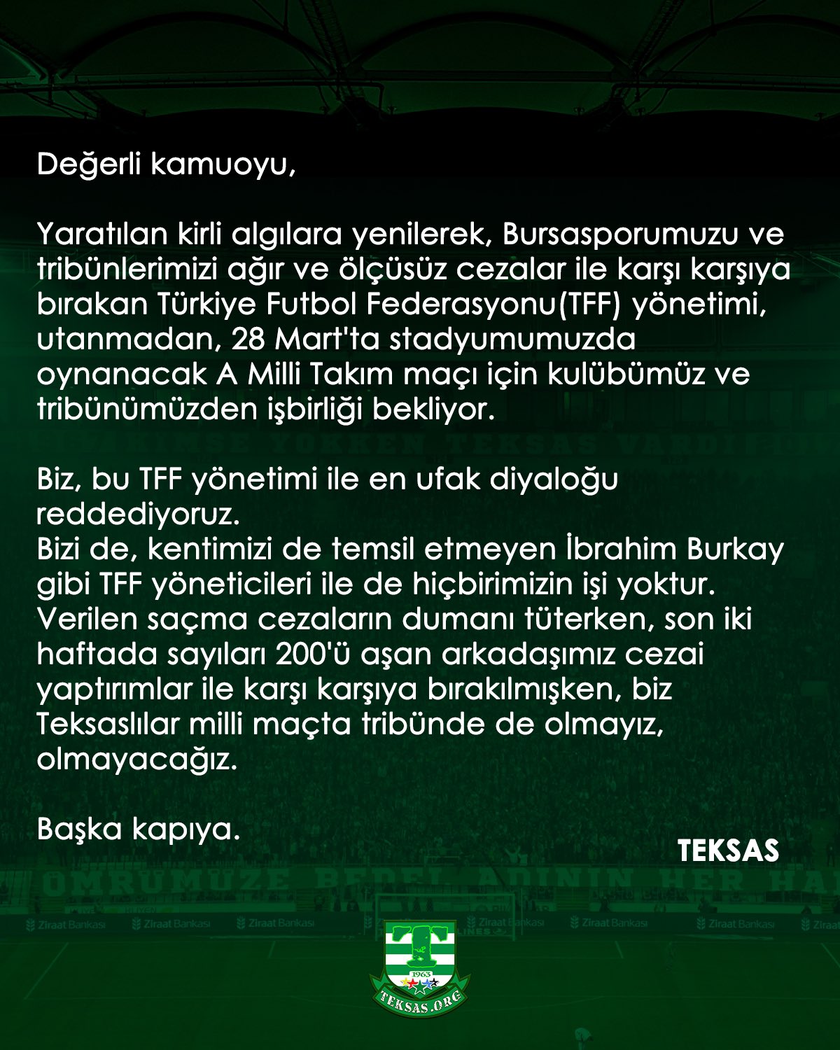 Yeşil beyazlı kulübün taraftar grubu Teksas, 28 Mart’fa Bursa’da oynanacak Milli maç için destek isteyen TFF yönetimine cevap verdi…