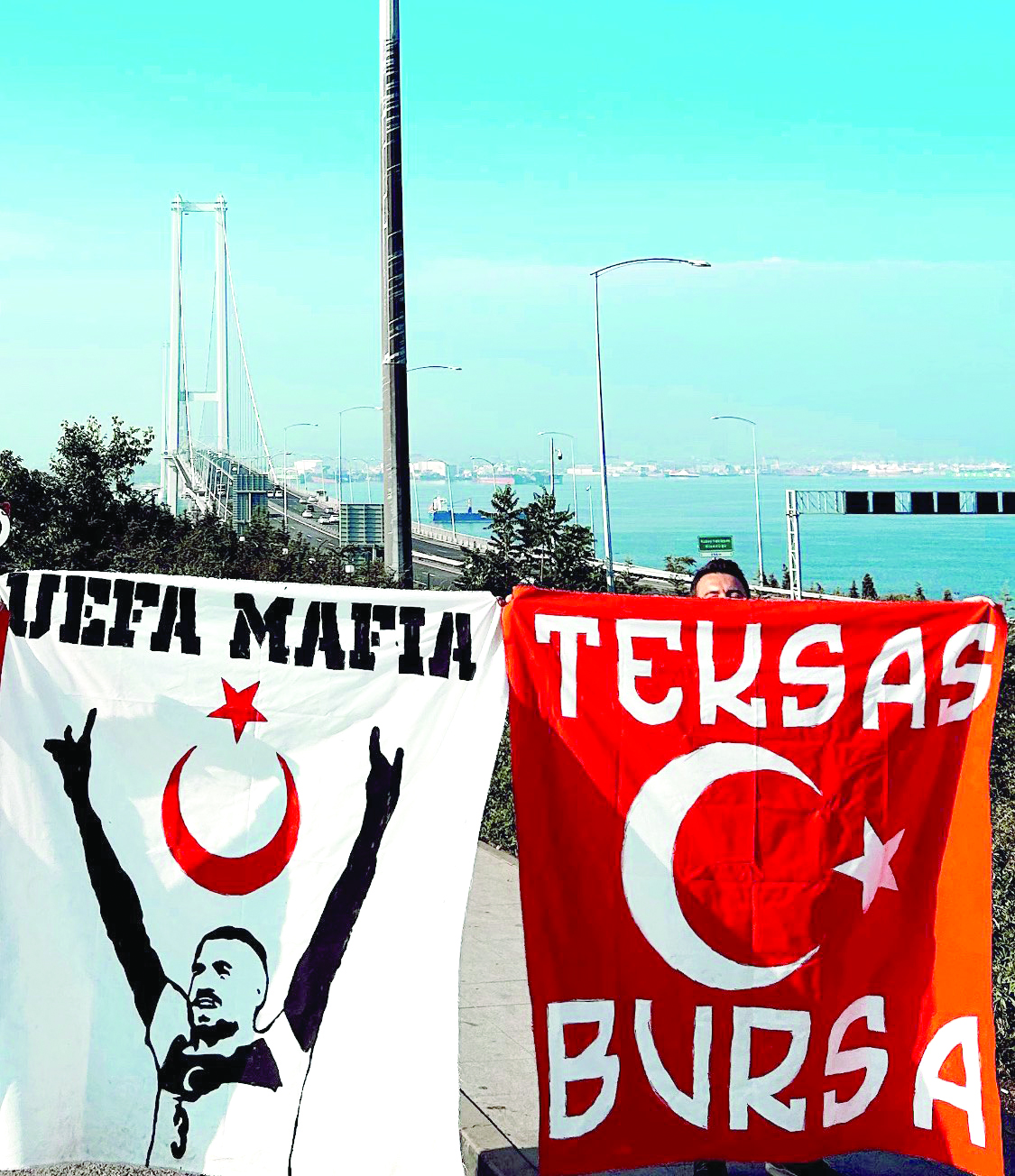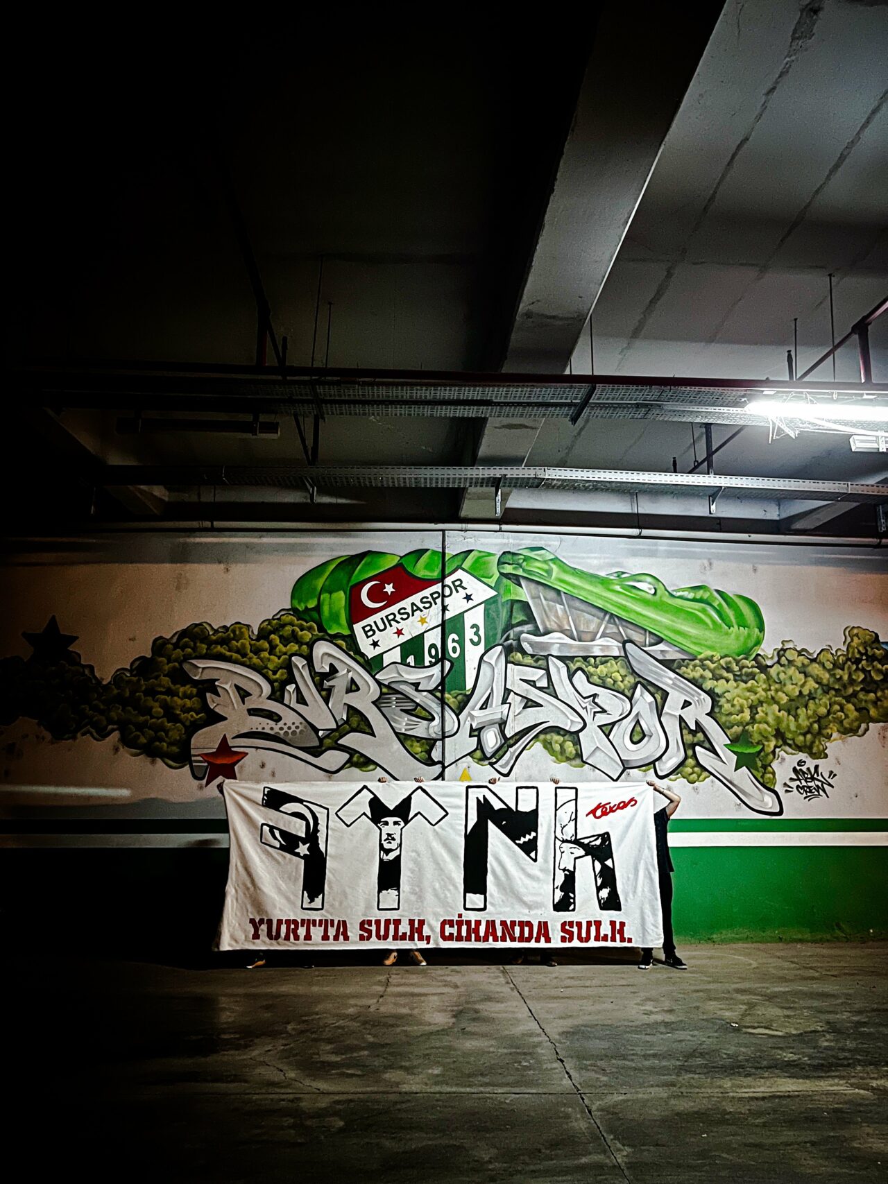 Bursaspor taraftarı, Merih Demiral’e destek olmak için Berlin’e kare pankart ve Göktürkçe “TÜRK” yazan set pankartı yolladı.