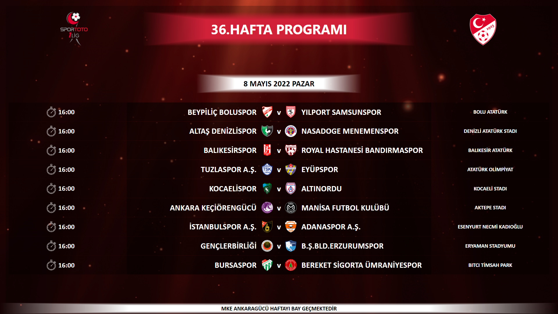 Ana Sayfa › Final › Futbol › Bursaspor-Ümraniye maçının günü ve saati açıklandı!Bursaspor-Ümraniye maçının günü ve saati açıklandı! 2021-2022 Sezonu Spor Toto 1. Lig 30. hafta müsabaka programı açıklandı. Giriş: 28-04-2022 14:56Kaynak: FutbolFinal ABONE OL + - Buna göre, tüm maçlar 8 Mayıs Pazar günü saat 16.00’da başlayacak… İŞTE PROGRAM HABERİ PAYLAŞ