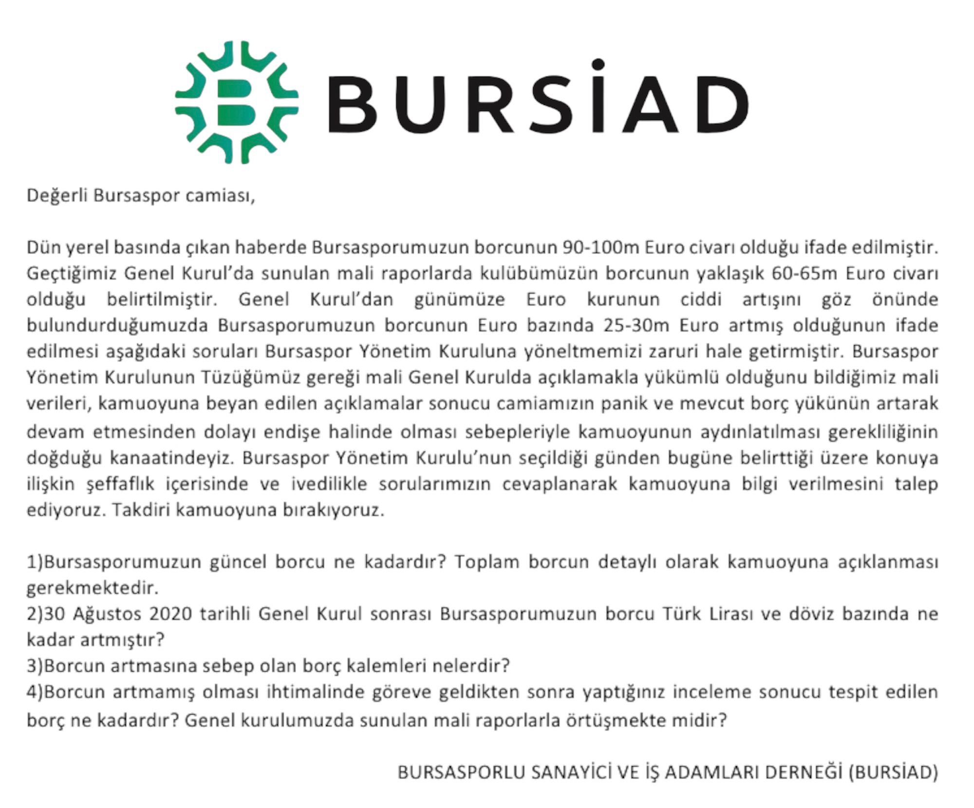 Bursasporlu Sanayici ve İş Adamları Derneği, sosyal medyadan yaptığı paylaşımla Bursaspor yönetimine kulübün mali durumuyla ilgili sorular sordu.