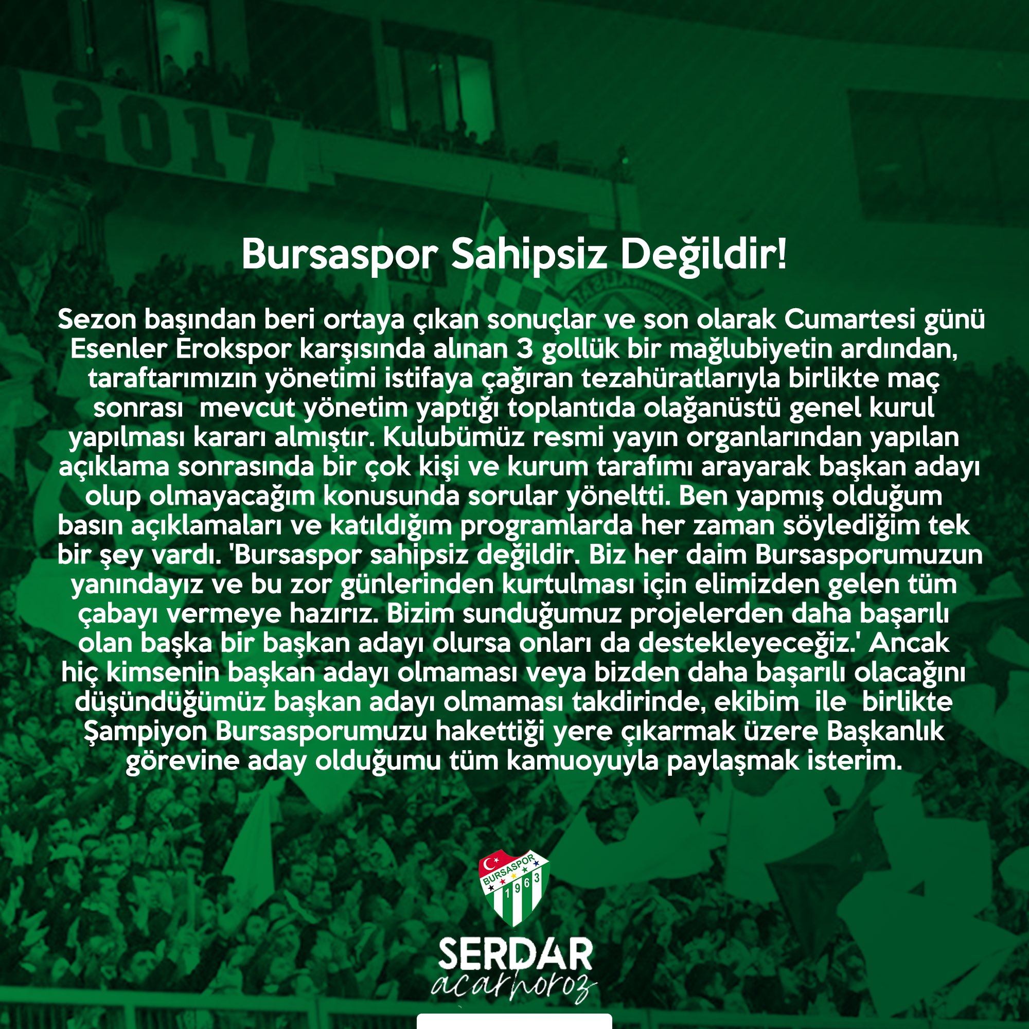 Bursaspor’a başkan adayı çıktı! Yeşil beyazlı kulüpte daha önce de göreve talip olan Serdar Acarhoroz, sosyal medya hesabından yeniden adaylığını duyurdu... 3 sene ago Serdar Acarhoroz’un sosyal medya hesabından yaptığı açıklama şöyle;