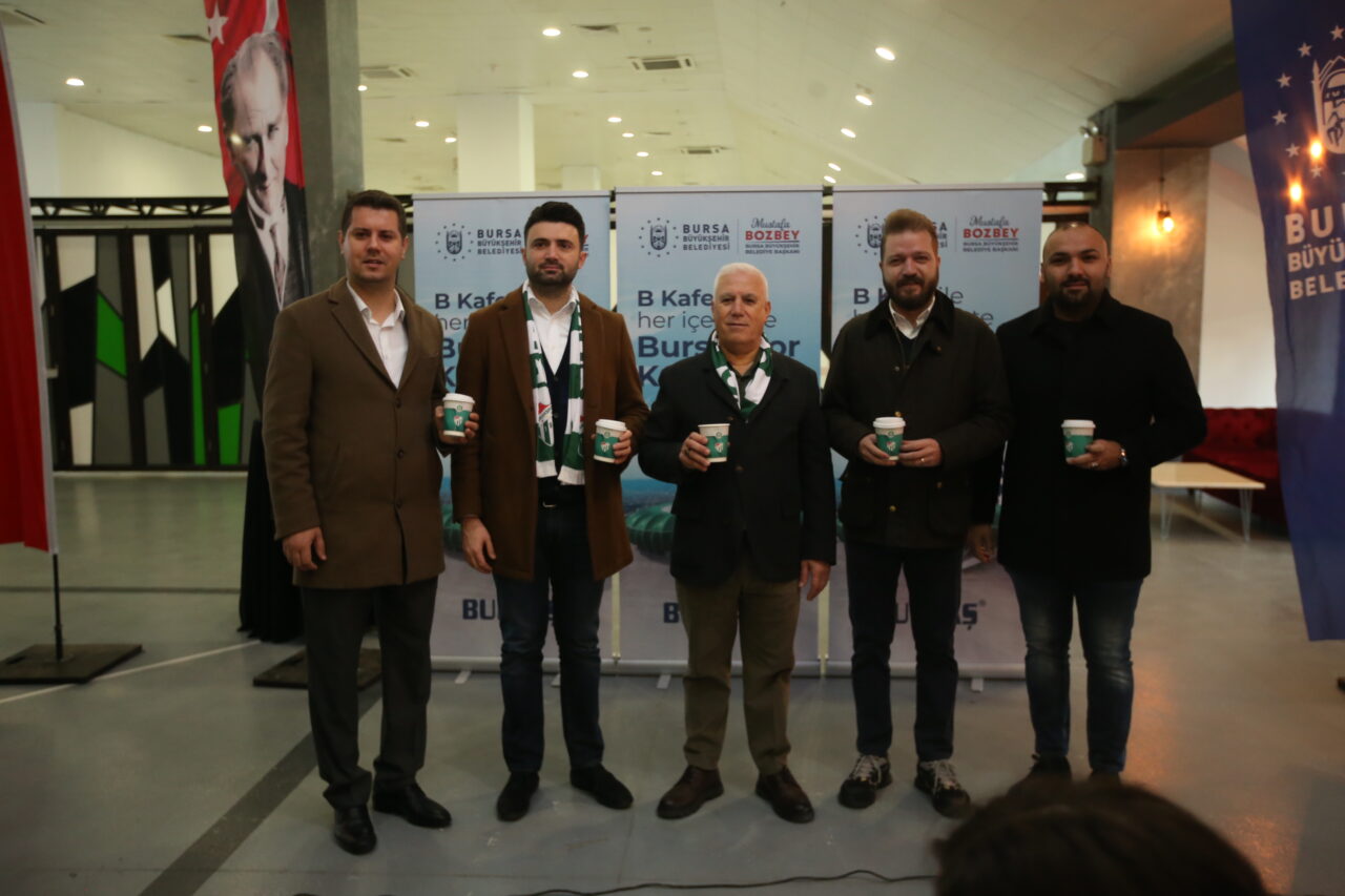 Bursa Büyükşehir Belediyesi, Bursaspor’a katkısını devam ettiriyor. Belediye’ye ait B Kafe’lerde Bursaspor lisanslı bardaklardan alınacak her içecekte yeşil beyazlı kulüp 10 TL kazanacak. Projeyle ilgili dün Atatürk Spor Kompleksi Matlı Stadyumu’nda tanıtım toplantısı gerçekleştirildi. Toplantıya Büyükşehir Belediye Başkanı Mustafa Bozbey ile Bursaspor Başkanı Enes Çelik, yönetim kurulu üyeleriyle BURFAŞ yöneticileri de katıldı.