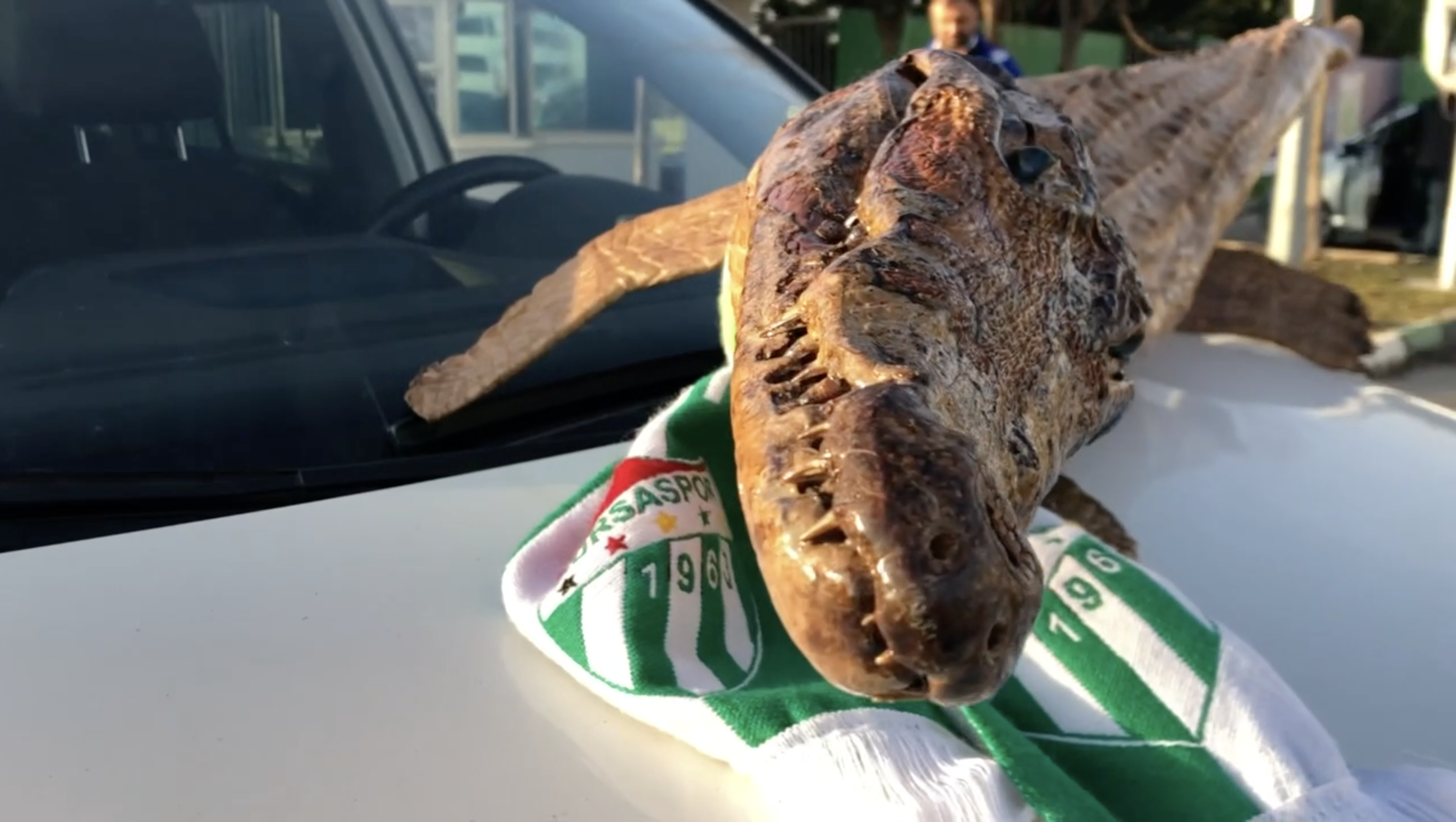 Yeşil-beyazlı bir taraftar, Sudan’dan aldığı doldurulmuş gerçek bir timsaha atkı takarak, Özlüce İbrahim Yazıcı Tesisleri’nin yolunu tuttu.