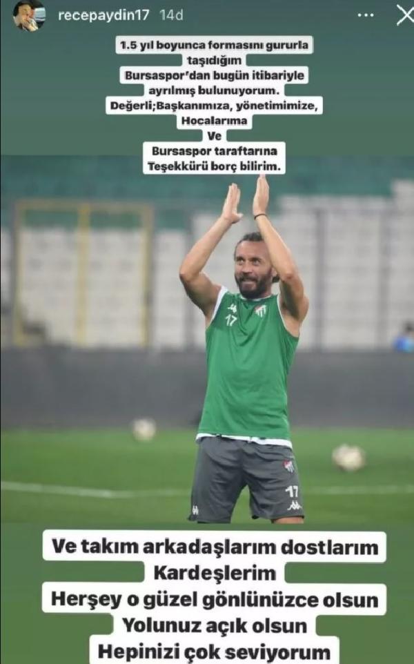 Transfer engeli nedeniyle kadrosuna henüz takviye gerçekleştiremeyen Bursaspor’da, Recep Aydın ile yollar ayrıldı. Daha önce takımdan özel izin alan 30 yaşındaki oyuncu, yeşil beyazlı camiaya veda mesajı yayınladı.