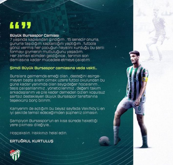 Ertuğrul Kurtuluş, yayınladığı veda mesajıyla Bursaspor’dan ayrıldığını duyurdu. Genç futbolcu Pendikspor ile anlaşmaya vardı.