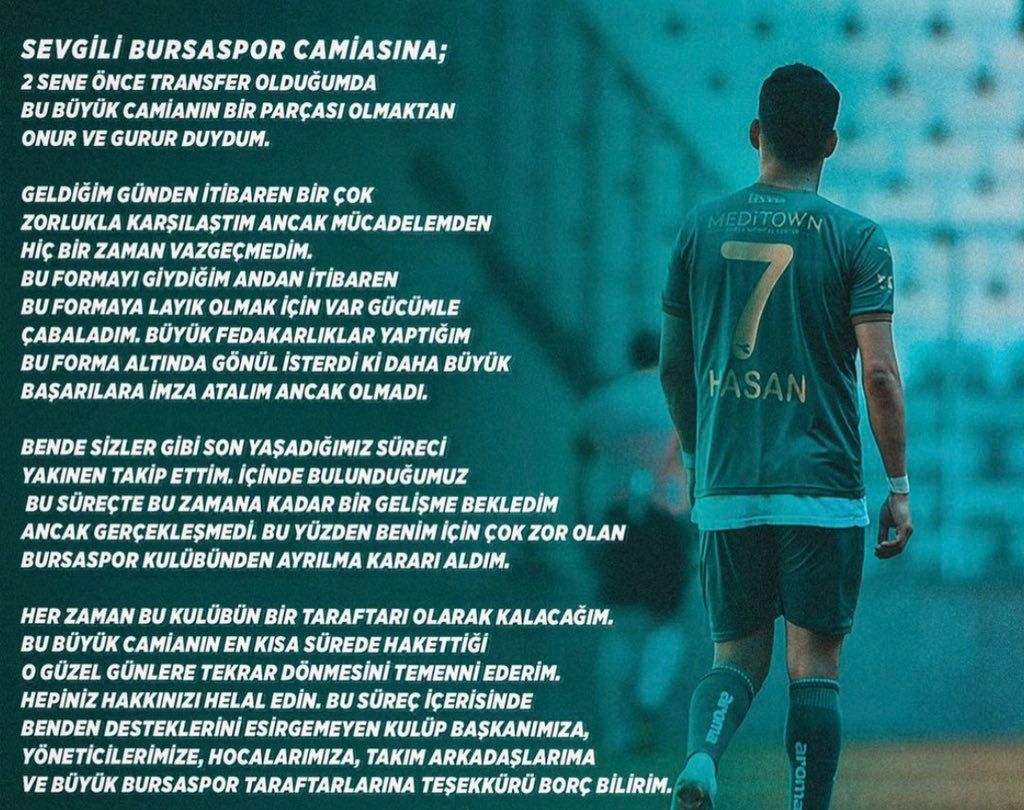 28 yaşındaki futbolcu, ‘Sevgili Bursaspor camiasına’ başlıklı yazısında şu ifadelere yer verdi: “2 sene önce transfer olduğumda bu büyük camianın bir parçası olmaktan onur ve gurur duydum. Geldiğim günden itibaren bir çok zorlukla karşılaştım ancak mücadelemden hiçbir zaman vazgeçmedim. Bu formayı giydiğim andan itibaren bu formaya layık olmak için var gücümle çabaladım. Büyük fedakarlıklar yaptığım bu forma altında gönül isterdi ki daha büyük başarılara imza atalım ancak olmadı. Ben de sizler gibi son yaşadığımız süreci yakinen takip ettim. İçinde bulunduğumuz bu süreçte bu zamana kadar bir gelişme bekledim ancak gerçekleşmedi. Bu yüzden benim için çok zor olan Bursaspor Kulübü’nden ayrılma kararı aldım. Her zaman bu kulübün bir taraftarı olarak kalacağım. Bu büyük camianın en kısa sürede hak ettiği o güzel günlere tekrar dönmesini temenni ederim. Hepiniz hakkınızı helal edin. Bu süreç içerisinde benden desteklerini esirgemeyen kulüp başkanımıza, yöneticilerimize, hocalarımıza, takım arkadaşlarıma ve büyük Bursaspor taraftarlarına teşekkürü borç bilirim.”