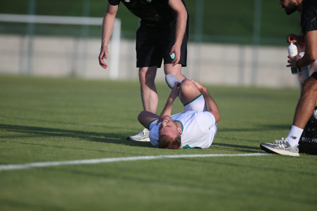 Acı içinde yerde kalan tecrübeli futbolcu, yapılan tedavi sonrasında oyuna devam etti.