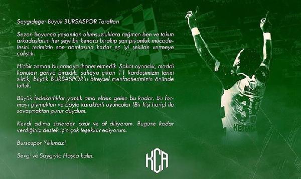 31 yaşındaki oyuncu yaptığı açıklamada, “Saygıdeğer büyük Bursaspor taraftarı, sezon boyunca yaşanılan olumsuzluklara rağmen ve takım arkadaşlarım her şeyi bir kenara bırakıp şampiyonluk mücadelesini terimizin son damlasına kadar en iyi şekilde vermeye çalıştık. Hiçbir zaman bu armaya ihanet etmedik. Sakat oynadık, maddi konuları geriye bıraktık, sahaya çıkan 11 kardeşimizin terini sildik, büyük Bursaspor’u bireysel menfaatlerimizin önünde tuttuk. Büyük fedakarlıklar yaptık ama elden gelen bu kadar. Bu formayı giymekten ve böyle karakterli oyuncular (bir kişi hariç) ile savaşmaktan gurur duydum. Kendi adıma sizlerden özür ve af diliyorum. Bugüne kadar verdiğiniz destek için çok teşekkür ediyorum. Bursaspor yıkılmaz! Sevgi ve saygıyla hoşça kalın” ifadelerine yer verdi.
