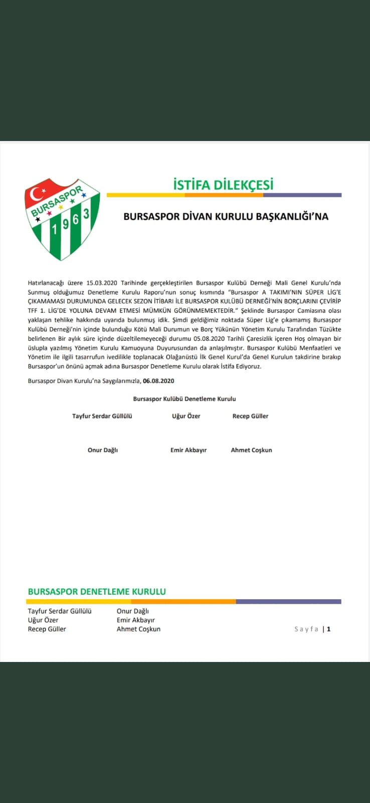 “Hatırlanacağı üzere 15.03.2020 tarihinde gerçekleşen Bursaspor Kulübü Derneği Mali Genel Kurulu’nda sunmuş olduğumuz Denetleme Kurulu Raporu’nun sonuç kısmında ‘Bursaspor A Takımı’nın Süper Lig’e çıkamaması durumunda gelecek sezon itibari ile Bursaspor Kulübü Derneği’nin borçlarını çevirip TFF 1.Lig’de yoluna devam etmesi mümkün görünmemektedir” şeklinde Bursaspor camiasına olası yaklaşan tehlike hakkında uyarıda bulunmuş idik.”
