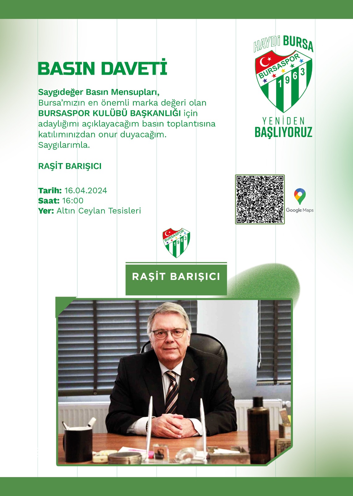 Bursaspor’da 18-26 Mayıs tarihlerinde yapılması planan olağan genel kurul öncesinde kulislerde birçok ismin adaylığı konuşulurken, Raşit Barışıcı salı günü saat 16.00’da, Altın Ceylan Tesisleri’nde adaylık açıklaması yapacağını duyurdu.