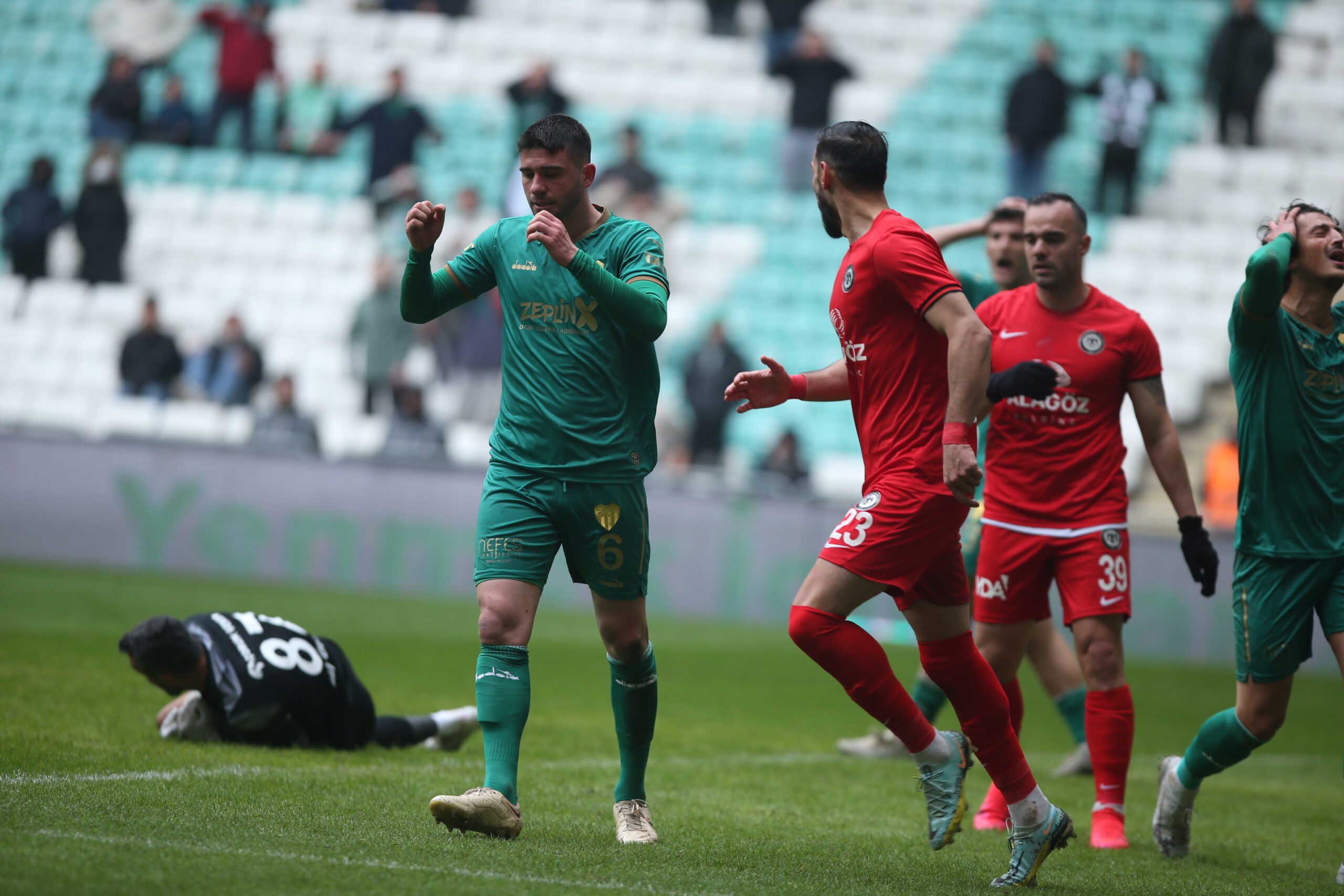 Taraftarının önünde bırakın hücuma çıkmayı, doğru düzgün savunma bile yapamayan yeşil beyazlı takımın klas ayaklara sahip rakibi karşısında aciz duruma düşmesi yürekleri sızlattı. Kaleci Deniz Aydın kurtarışlarıyla skorun daha da açılmasını önlemesi tek teselli oldu.
