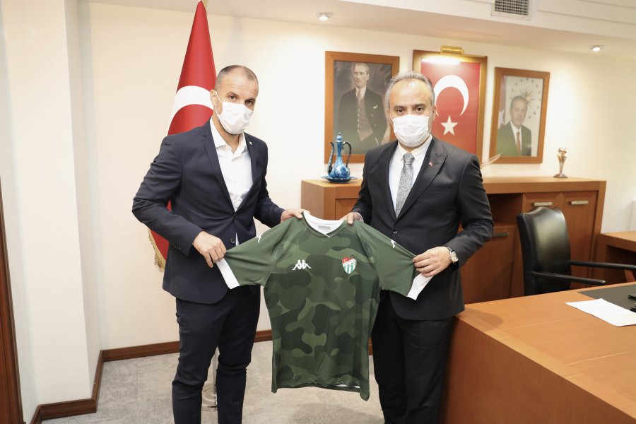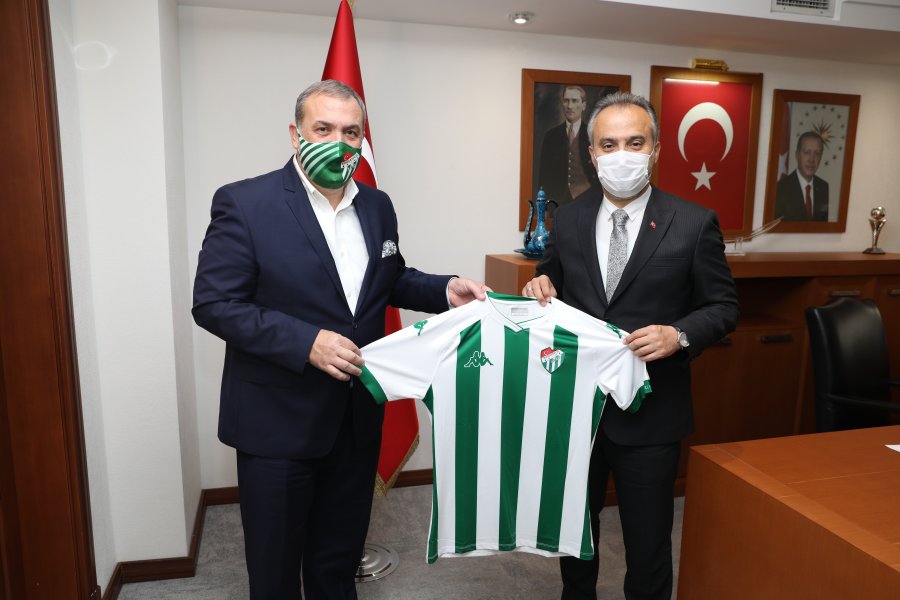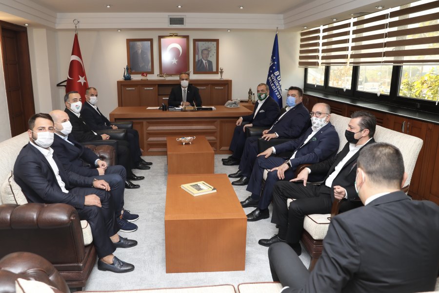 Bursaspor Başkanı Erkan Kamat ve Yönetim Kurulu Üyeleri Mesut Günal, Mesut Gündüz, Salih Güleç, Sedat Şengül, Talip Aynigül, Ünsal Mendi ve Yönetim Kurulu Yedek Üyesi Özgen Karadayı ile Teknik Direktör Mustafa Er, Büyükşehir Belediye Başkanı Alinur Aktaş’ı ziyaret etti.