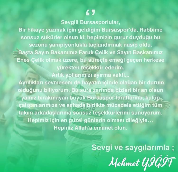 Bursaspor kulübü de “Şampiyon kadromuzda yer alan profesyonel futbolcu Mehmet Yiğit’e kulübümüze kattıkları, özverisi ve üstün gayretleri için teşekkür ediyor; kariyerinin bundan sonraki döneminde başarılar diliyoruz” ifadeleriyle tecrübeli futbolcuya teşekkür etti.