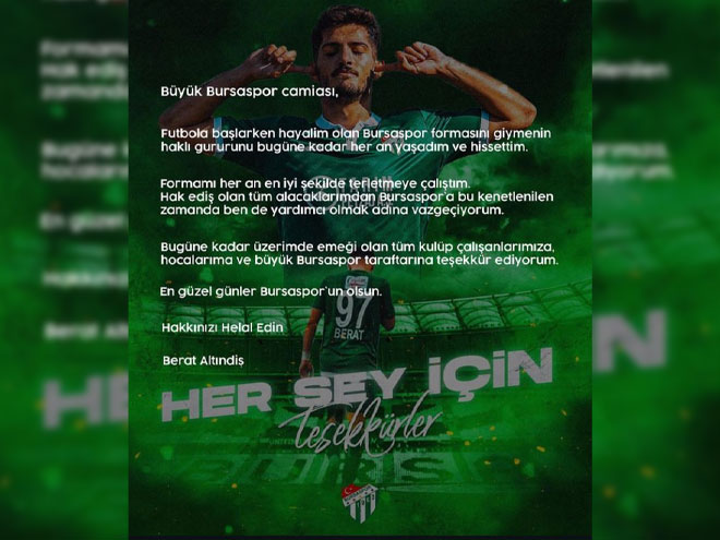 Berat Altındiş, ayrılığın ardından yeşil beyazlı camiaya veda mesajı yayınladı. ”Hakkınızı helal edin” diyen Altındiş, ”en güzel günler Bursaspor’un olsun” dedi.