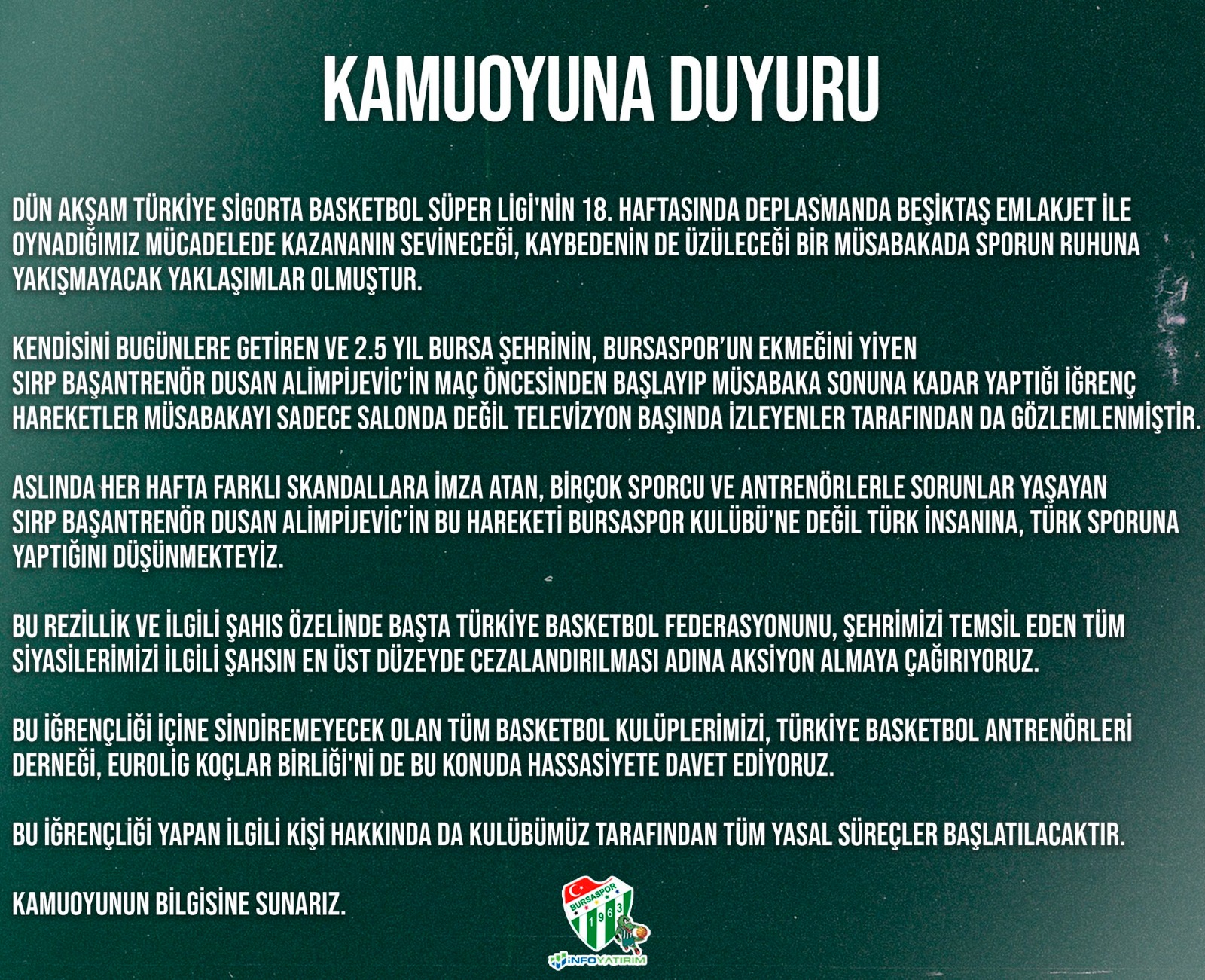 Türkiye Sigorta Basketbol Süper Ligi’ndeki temsilcilerimizden Bursaspor İnfo Yatırım, dün akşam deplasman Beşiktaş Emlakjet ile oynanan maçta siyah beyazlı takımın başantrenörü Dusan Alimpijevic’e tepki gösterdi.