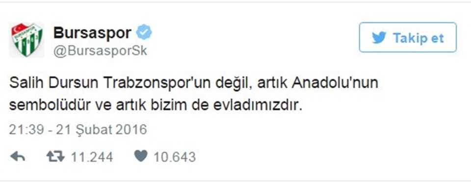 Trabzonspor camiası olaya sert tepki gösterirken, bir destek de Bursaspor’dan geldi. Yeşil-beyazlı ekip, sosyal medya hesabından “Salih Dursun Trabzonspor’un değil, artık Anadolu’nun sembolüdür ve artık bizim de evladımızdır” açıklamasını yayınlayarak Salih Dursun’a destek verdi.
