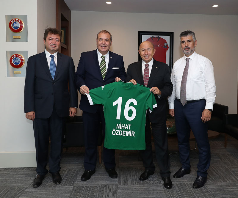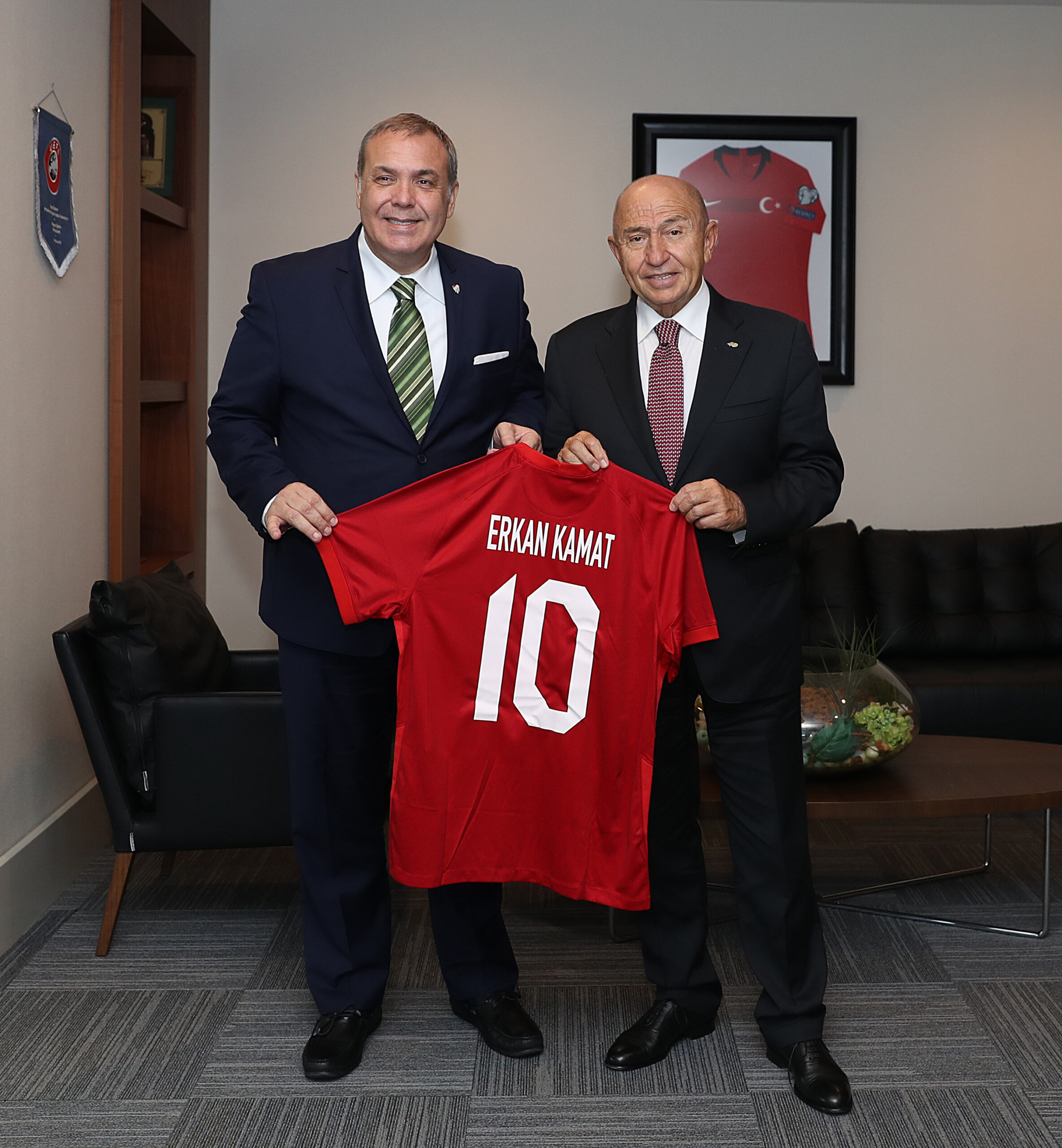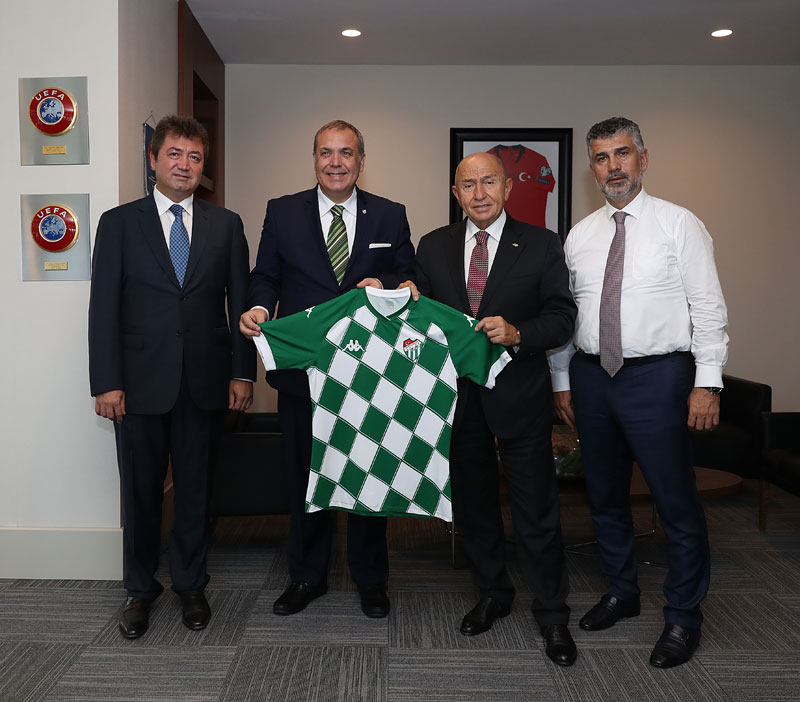 Ziyarette Bursaspor Başkanı Erkan Kamat, TFF Başkanı Nihat Özdemir’e Bursaspor forması hediye etti. TFF Başkanı Özdemir de Bursaspor Başkanı Erkan Kamat ve yönetim kurulu üyelerine A Milli Takımımızın formasını takdim etti. 30 Ağustos’ta gerçekleşen olağanüstü genel kurulda göreve seçilen ve 1 Eylül’de mazbatasını alarak yeşil beyazlı kulübün dağ gibi biriken sorunlarının çözümü için kolları sıvayan Erkan Kamat yönetiminin TFF Başkanı ve yöneticileriyle yaptığı toplantının hayli verimli geçtiği öğrenildi. Transfer tahtası kapalı olan Bursaspor’un alacaklılarla görüşmelerde yeniden yapılandırmaya gittiği ve sorunları birer birer aştığı ifade edildi.