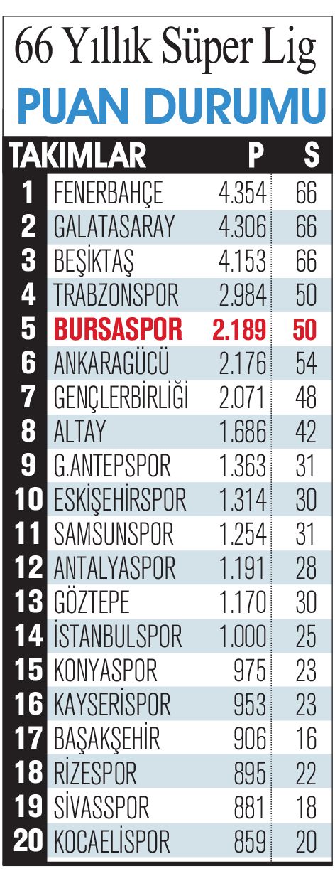 Tarihte Süper Lig’de 50 sezon geçiren Bursaspor’un, 2.189 puanı bulunuyor. Zirvede 4.354 puanla Fenerbahçe yer alırken, Galatasaray’ın 4.306, Beşiktaş’ın 4.153, Trabzonspor’un ise 2.984 puanı bulunuyor. Bursaspor’un ardından 6. basamakta MKE Ankaragücü yer alırken, Gençlerbirliği 2.071, Altay 1.686, kapanan Gaziantepspor’un ise 1.363 puanı bulunuyor.