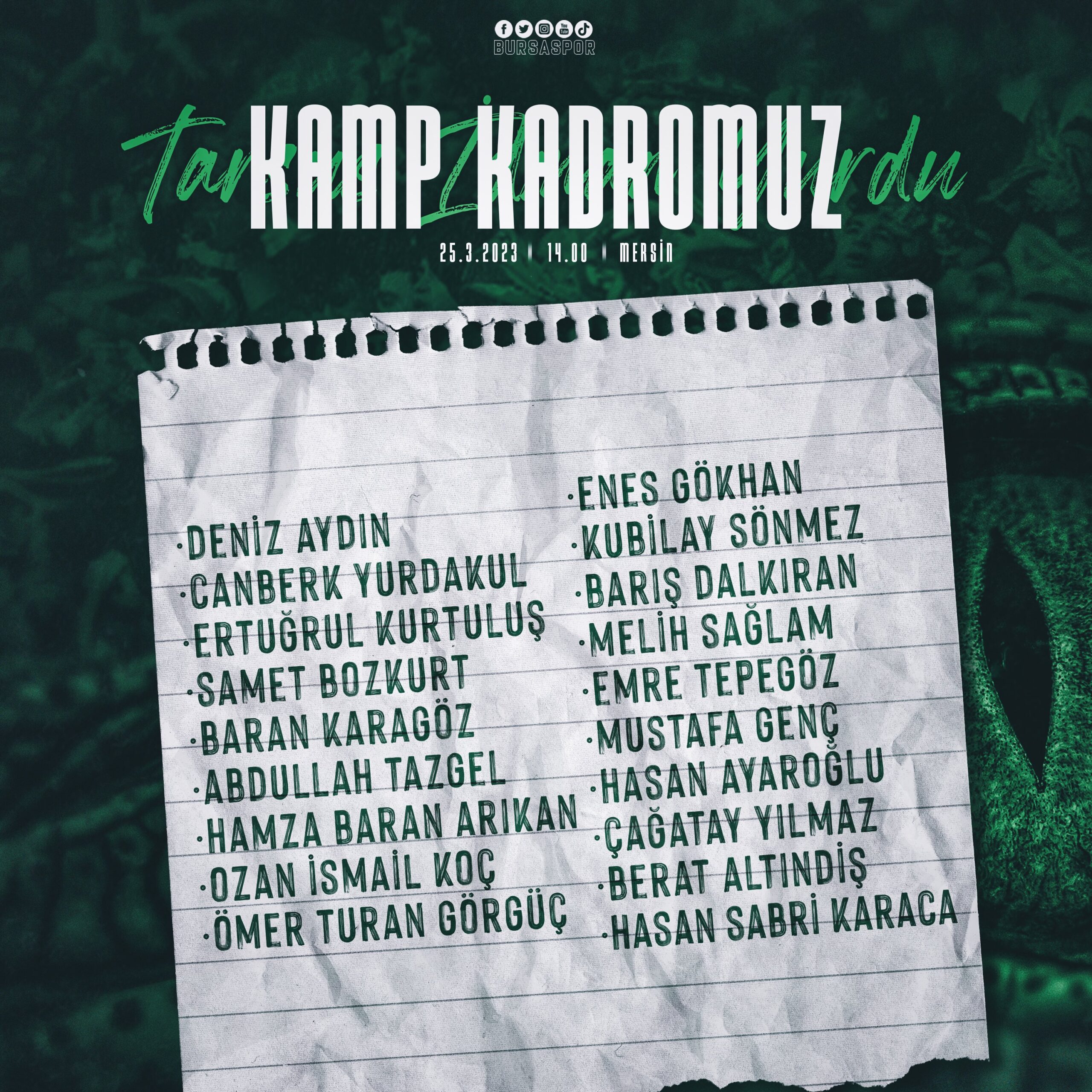 Yeşil beyazlı takımda sarı kart cezalısı Enver Cenk Şahin ile birlikte sakatlıkları süren Özer Hurmacı, Furkan Emre Ünver, Bilal Güney, Eren Tunalı, Eren Güler ve Kerem Kök Tarsus’a götürülmedi. Teknik Direktör İsmail Ertekin’in kale dahil birkaç mevkide değişiklik yapması bekleniyor. Çarşamba günü de evinde Bayburt Özel İdari ile karşılaşacak olan Bursaspor mart ayını çifte galibiyetle kapatmanın hesabını yapıyor.