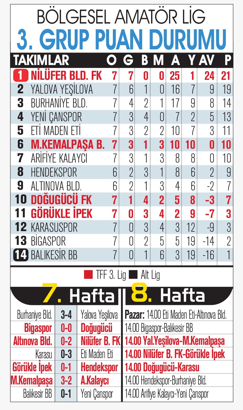 Sezona şampiyonluk parolasıyla başlayan Bölgesel Amatör Lig (BAL) 3. Grup temsilcilerimizden Nilüfer Belediye Futbol Kulübü, yoluna doludizgin devam ediyor. Bursaspor efsanesi Pablo Martin Batalla’nın çalıştırdığı mavi yeşil beyazlı ekip, oynadığı 7 maçın tamamını kazanarak 21 puanla, Yalova Yeşilova’nın 2, Burhaniye Belediyespor’un ise 7 puan önünde kayıpsız bir şekilde zirvede yer alıyor.