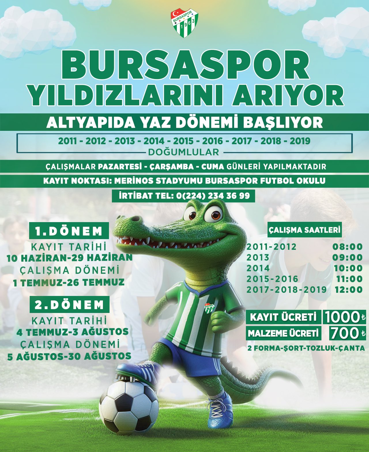 Futbol Okullarımızın yaz dönemi kayıtları başladı. 2011-2019 arasında doğan genç yeteneklerimizi Merinos Futbol Okullarımıza bekliyoruz.