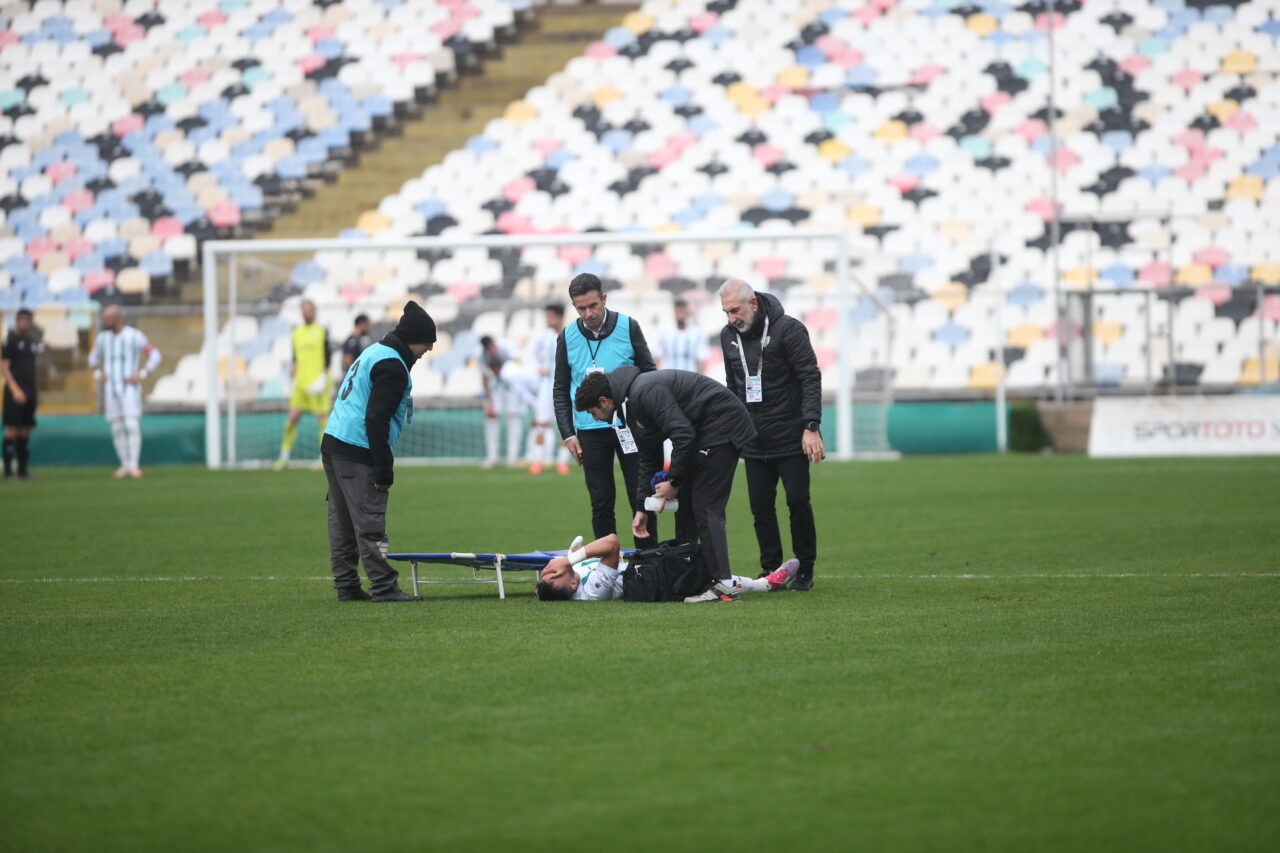 Bursaspor’da savunma oyuncusu Mehmet Yiğit sakatlanarak oyundan çıkmak zorunda kaldı. Bir pozisyon sonrasında yerde kalan tecrübeli futbolcu, 34. dakikada yerini Furkan Saki’ye bırakırken sahayı sedyeyle terk etti. Yiğit’in durumu yapılacak kontroller sonrasında netlik kazanacak.