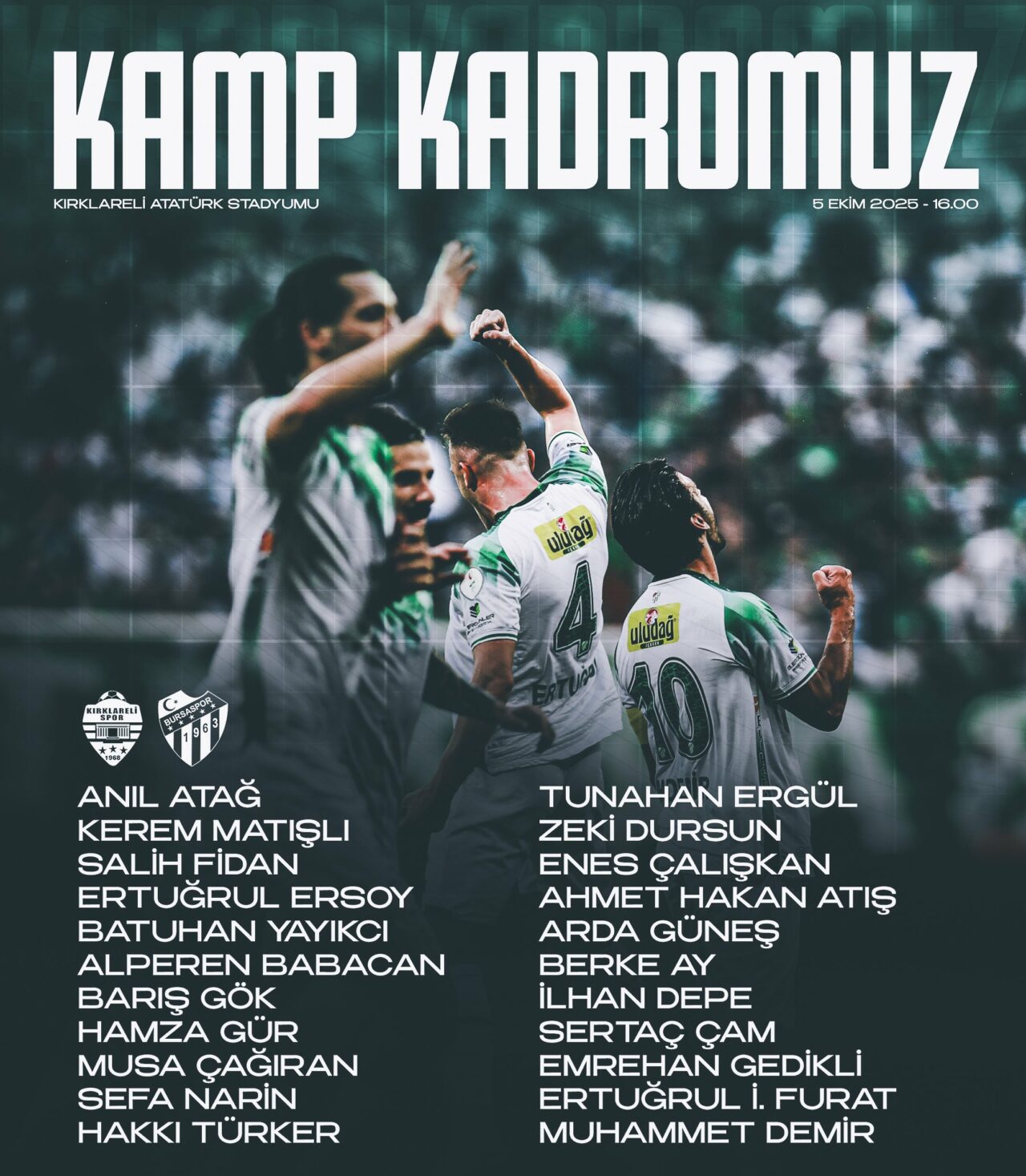 Nesine 2. Lig Kırmızı Grup 7. hafta mücadelesinde yarın deplasmanda Kırklarelispor ile karşılaşacak olan Bursaspor’un kamp kadrosu açıklandı.