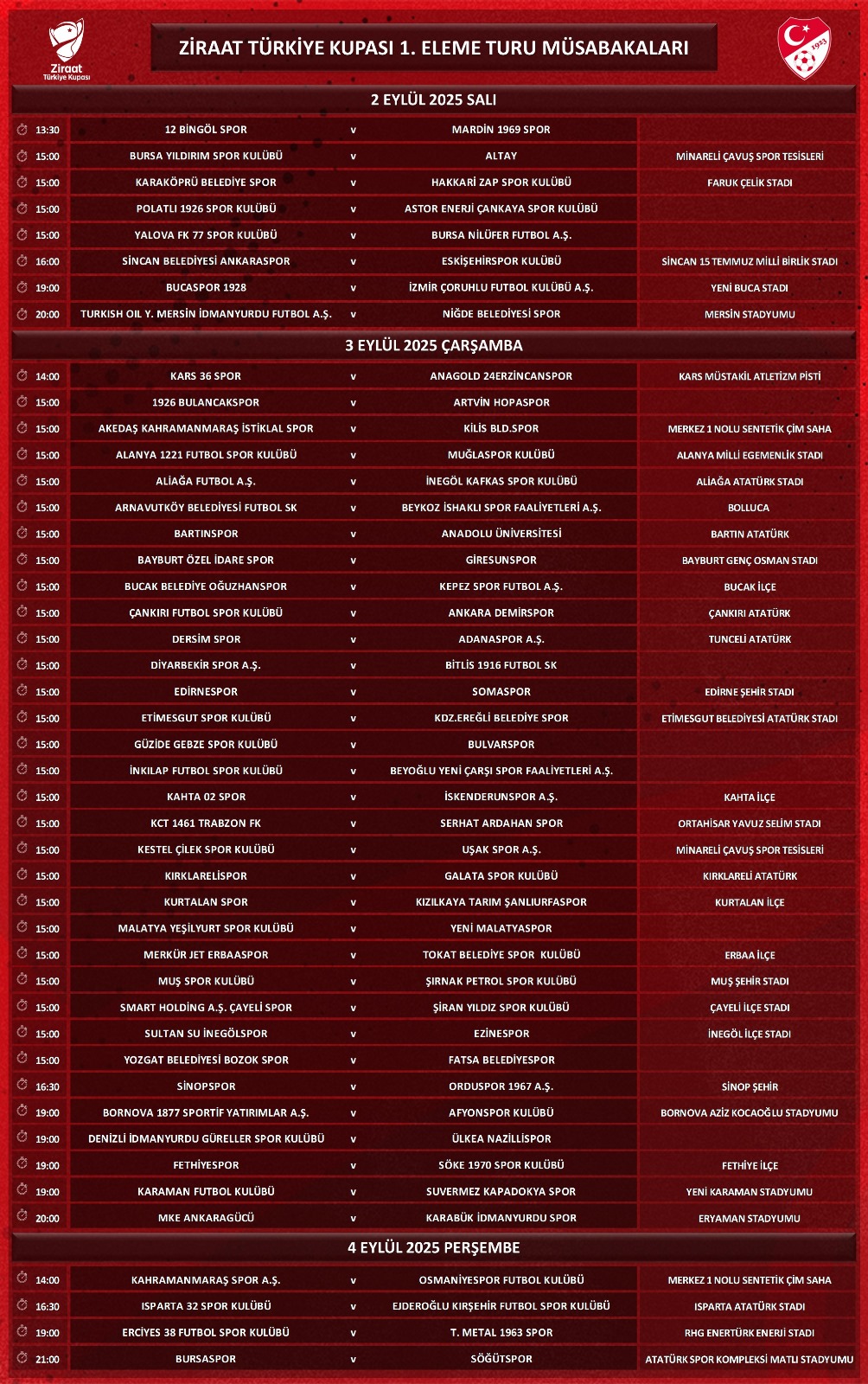 Ziraat Türkiye Kupası 1. Eleme Turu müsabakalarına ilişkin program açıklandı.