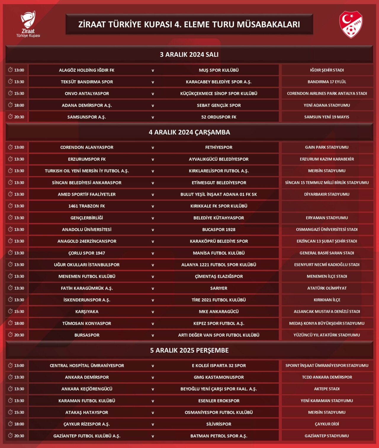 Ziraat Türkiye Kupası 4. Eleme Turu müsabakalarına ilişkin program açıklandı.