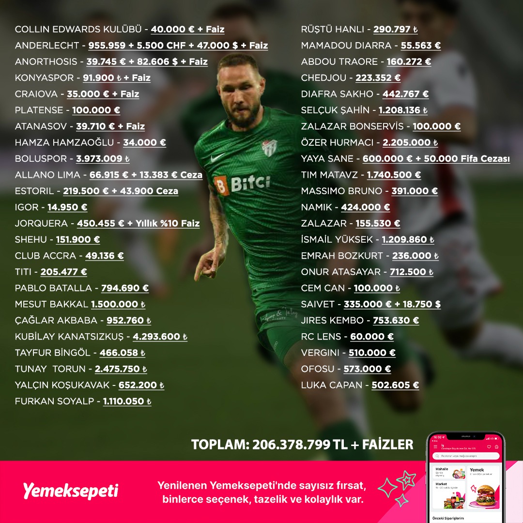 Kulübün toplam 1 milyar 58 milyon TL borcu olduğunu vurgulayan Banaz, “Kulüp lisans eksikliklerine ilişkin kesin olarak engel olan dosyaların bize yansıması toplamda 1 milyon Euro’yu aşkın. Filiz lisansla alakalı da 3 milyon Euro’nun üzerinde bize engel durum var. Bursaspor altyapısına 10 yaşındaki bir çocuğu dahi lisanslayamıyor. FIFA’da olan dosyalarımız yüzünden bu çocuklara lisans çıkartamıyorsunuz. Tahtaya engel olan toplam bedel 139 milyon 339 bin 993 TL’dir. Güncel faizlerle bu rakam 206 milyon TL’yi buluyor” şeklinde konuştu.