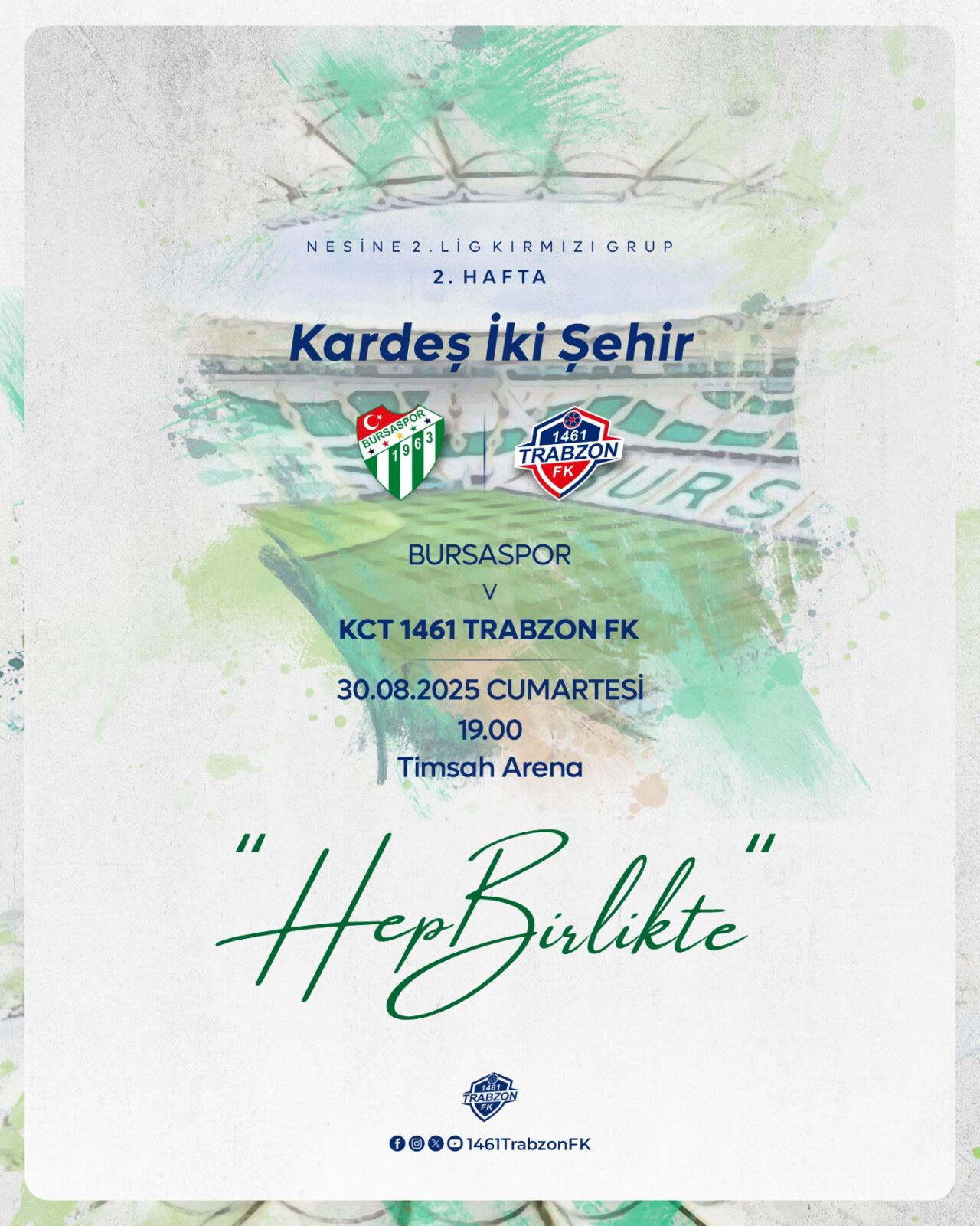 “KCT 1461 Trabzon FK, 30 Ağustos Cumartesi günü saat 19.00’da Bursaspor ile deplasmanda karşılaşacak. Kıymetli rakibi Bursaspor’la geçmişten süregelen dostluk bağlarını bir kez daha sahaya taşıyacak olan kulübümüz, bu önemli karşılaşmanın fair-play çerçevesinde ve dostluk havasında geçmesini temenni ediyor.