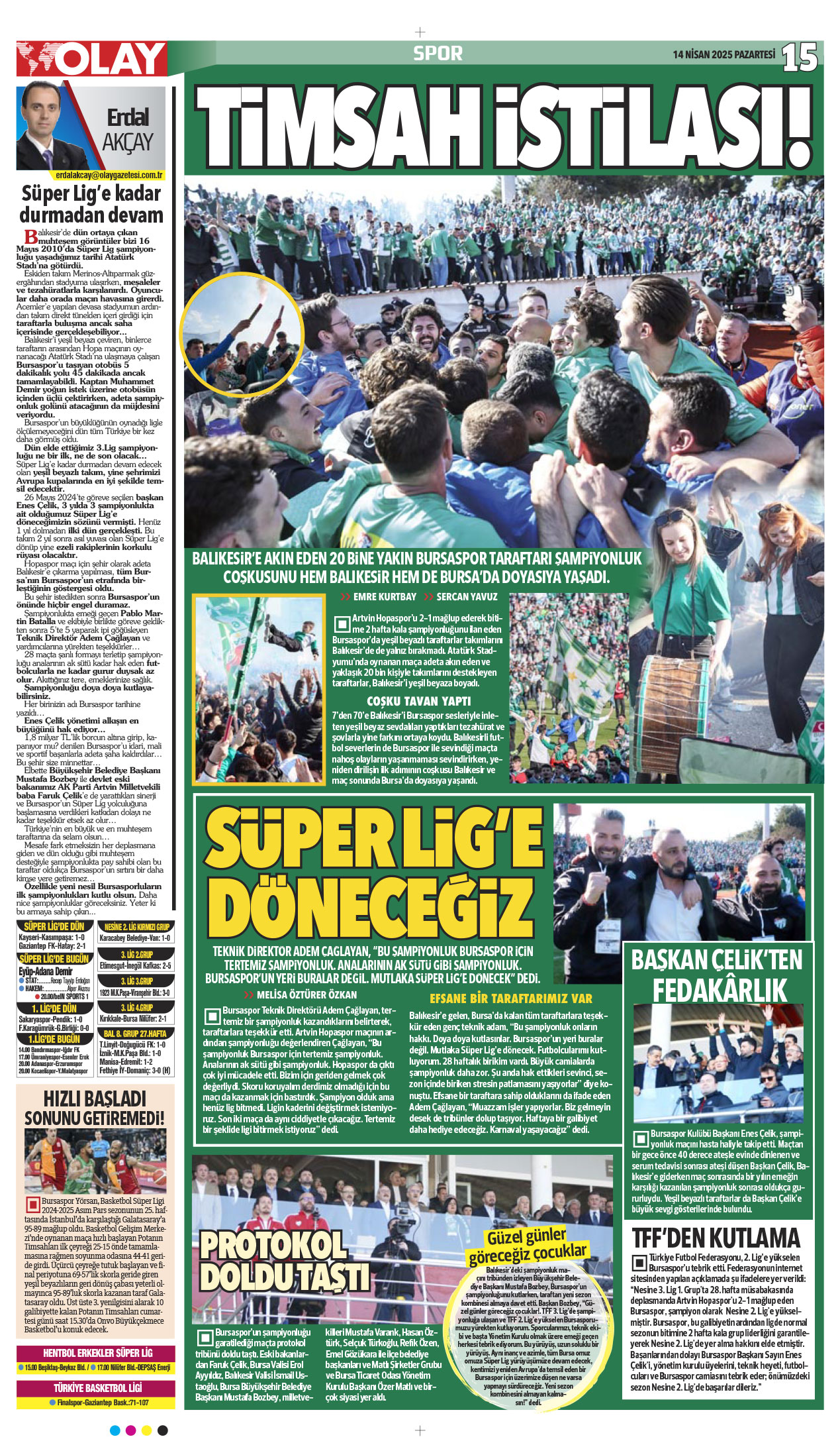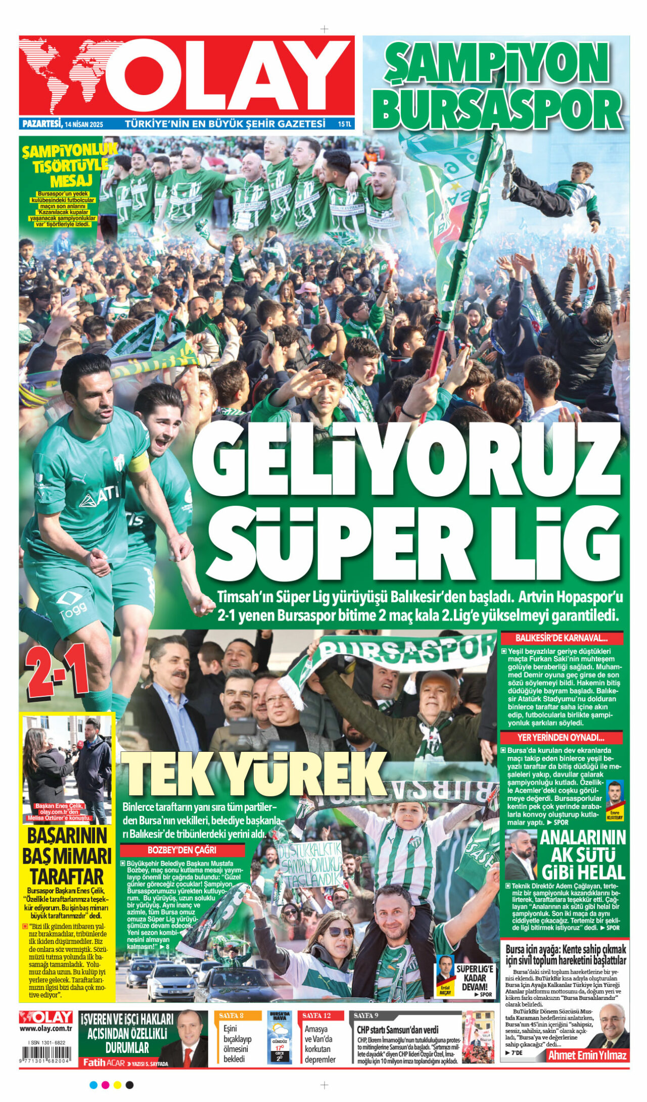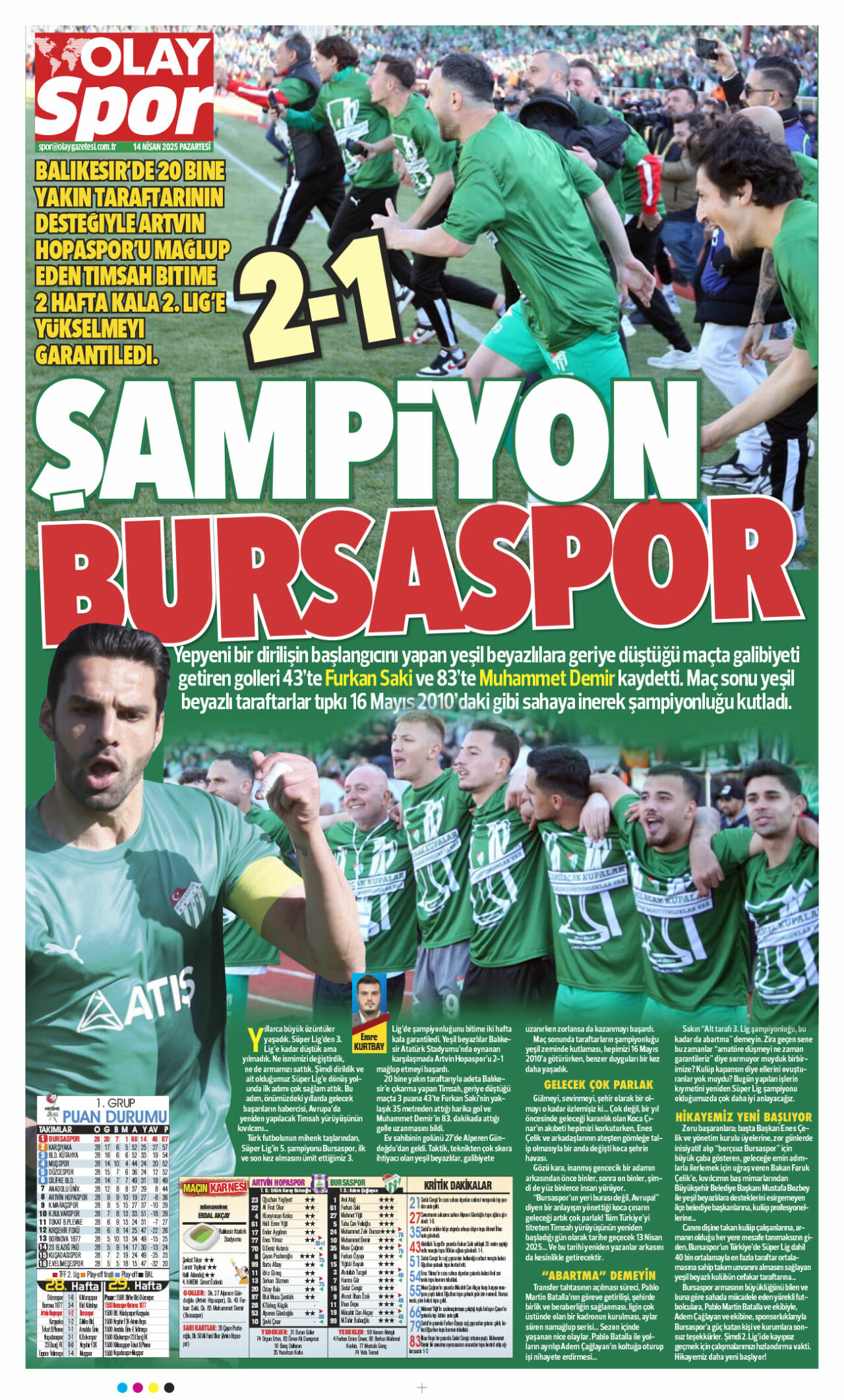 14 Nisan Pazartesi günü yayınlanan OLAY Gazetesi, spor sayfası dışında da 1. sayfasının tamamını Bursaspor’un şampiyonluğuna ayırarak, tarihe geçen bu başarıya manşetlerinde yer verdi.