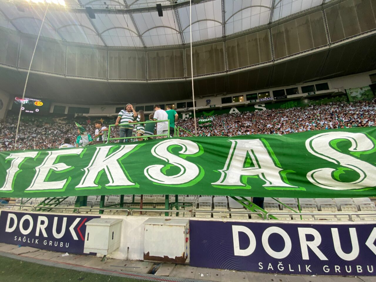Bursaspor’un taraftar grubu Teksas, Eskişehirspor maçında yeni set pankartıyla tribünde yerini alırken taraftarlar takıma büyük destek verdi.