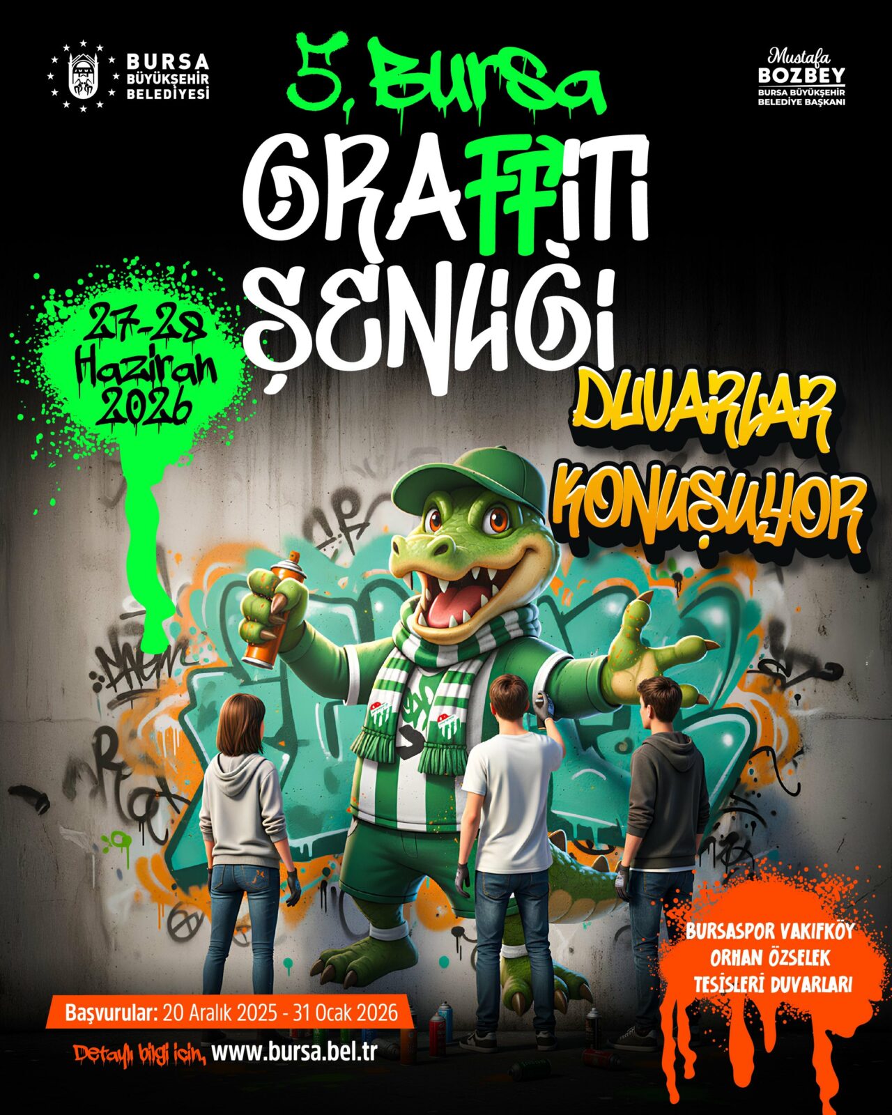 Graffiti Şenliği’nde yer almak isteyen sanatçılar için son başvuru tarihi ise 31 Ocak 2026 olarak açıklandı. Etkinliğe ilişkin başvuru ve detaylı bilgilere Bursa Büyükşehir Belediyesi’nin resmi kanalları üzerinden ulaşılabileceği belirtildi.