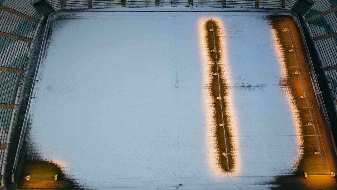 Sahanın içerisine yağan kar, çimlerin bakımı için açılan güneş panelleriyle bir kısmının erimesi dikkat çekti.