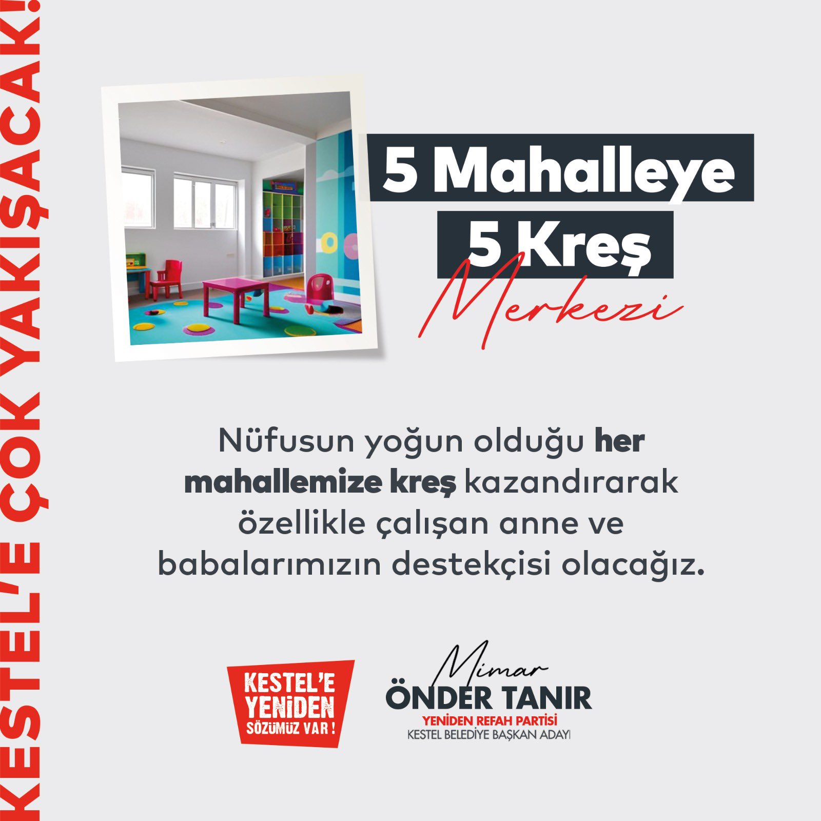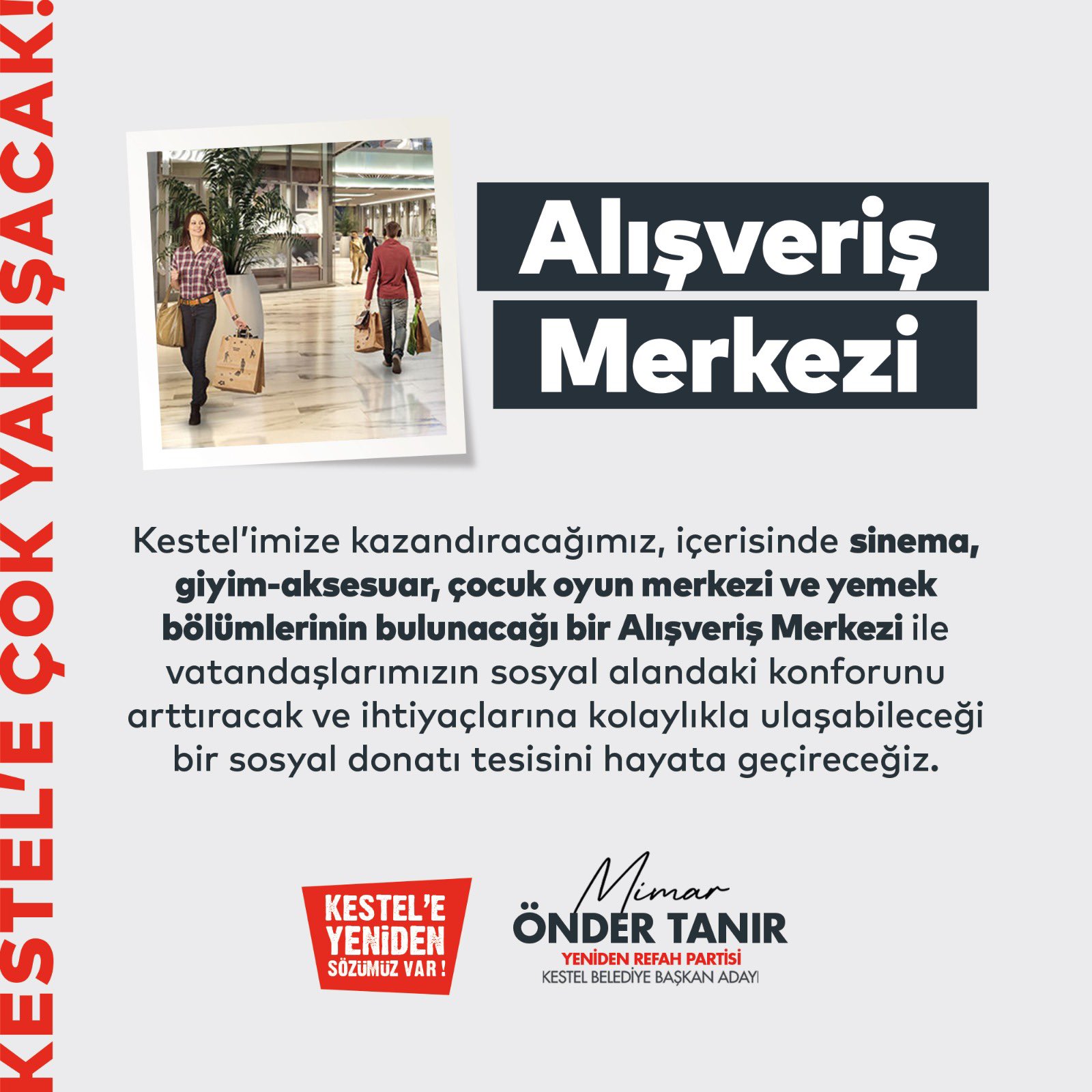 Alışveriş Merkezi, Kestel’e Çok Yakışacak! Kestel’imize kazandıracağımız, içerisinde sinema, giyim-aksesuar, çocuk oyun merkezi ve yemek bölümlerinin bulunacağı bir Alışveriş Merkezi ile vatandaşlarımızın sosyal alandaki konforunu arttıracak ve ihtiyaçlarına kolaylıkla ulaşabileceği bir sosyal donatı tesisini hayata geçireceğiz.