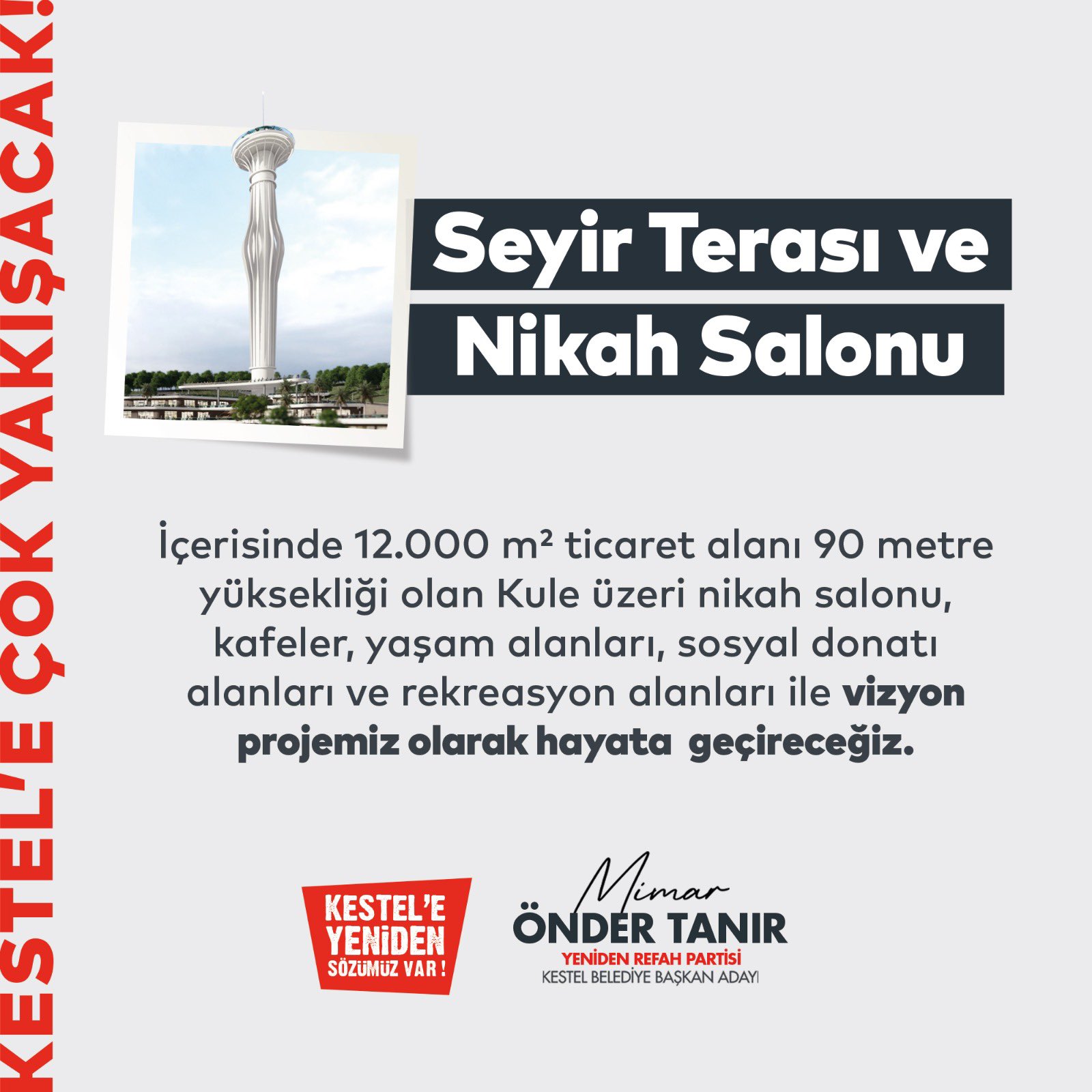 Seyir Terası ve Nikah Salonu, Kestel’e Çok Yakışacak! İçerisinde 12.000 m² ticaret alanı 90 metre yüksekliği olan Kule üzeri nikah salonu, kafeler, yaşam alanları, sosyal donatı alanları ve rekreasyon alanlarını vizyon projemiz olarak hayata geçireceğiz.