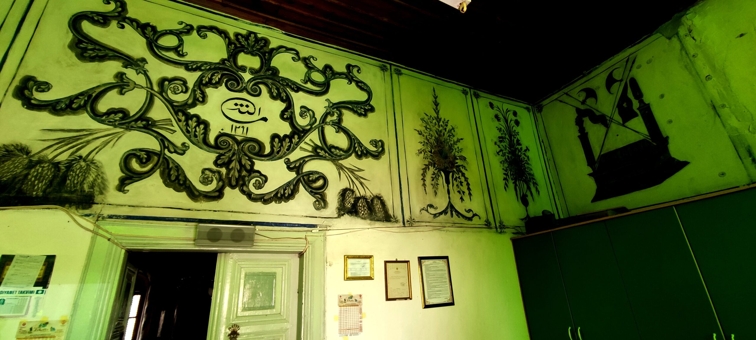 Caminin içerisinde kalem işleri ve ahşap süslemeleri bulunuyor. Caminin duvarlarında, pencere kenarlarında ve mihrapta başta selvi olmak üzere çiçek motifleri, kıvrık dallarla bezeli kalem işleri dikkati çekiyor. Görenleri kendine hayran bırakan tarihi camiye köylüler gözü gibi bakıyor.
