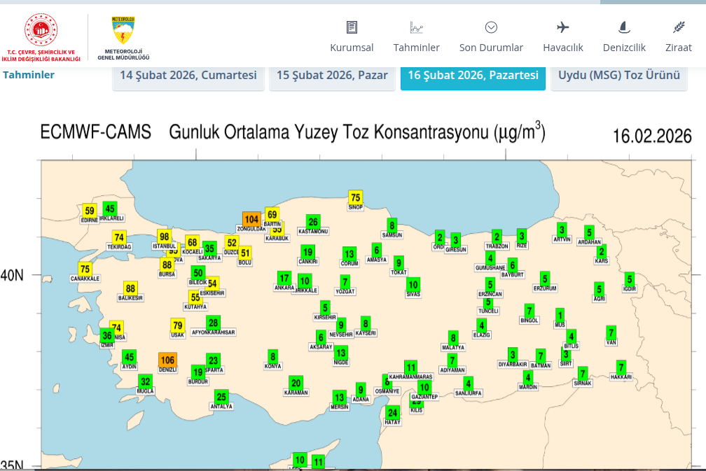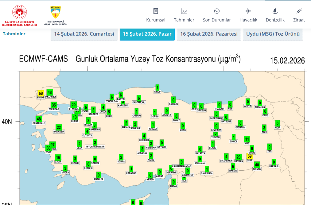 Meteoroloji Genel Müdürlüğü’nün İller için Toz Taşınımı Uyarı Sistemi’nin verilerine göre;