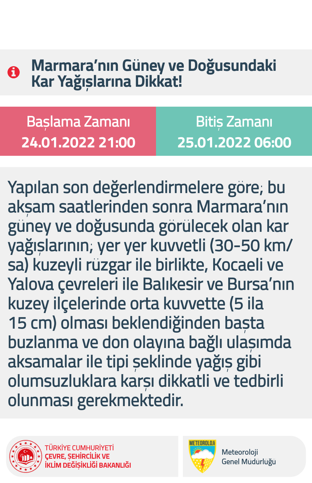 Marmara'nın Güney ve Doğusundaki Kar Yağışlarına Dikkat! pic.twitter.com/aygY0JbADV— Meteoroloji (MGM) (@meteoroloji_twi) January 24, 2022