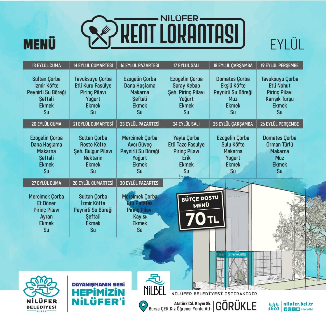 Sosyal ve halkçı belediyeciliğin sembol örneklerinden olan Nilüfer Kent Lokantası’nda bir yemek menüsü 70 liradan satılacak.