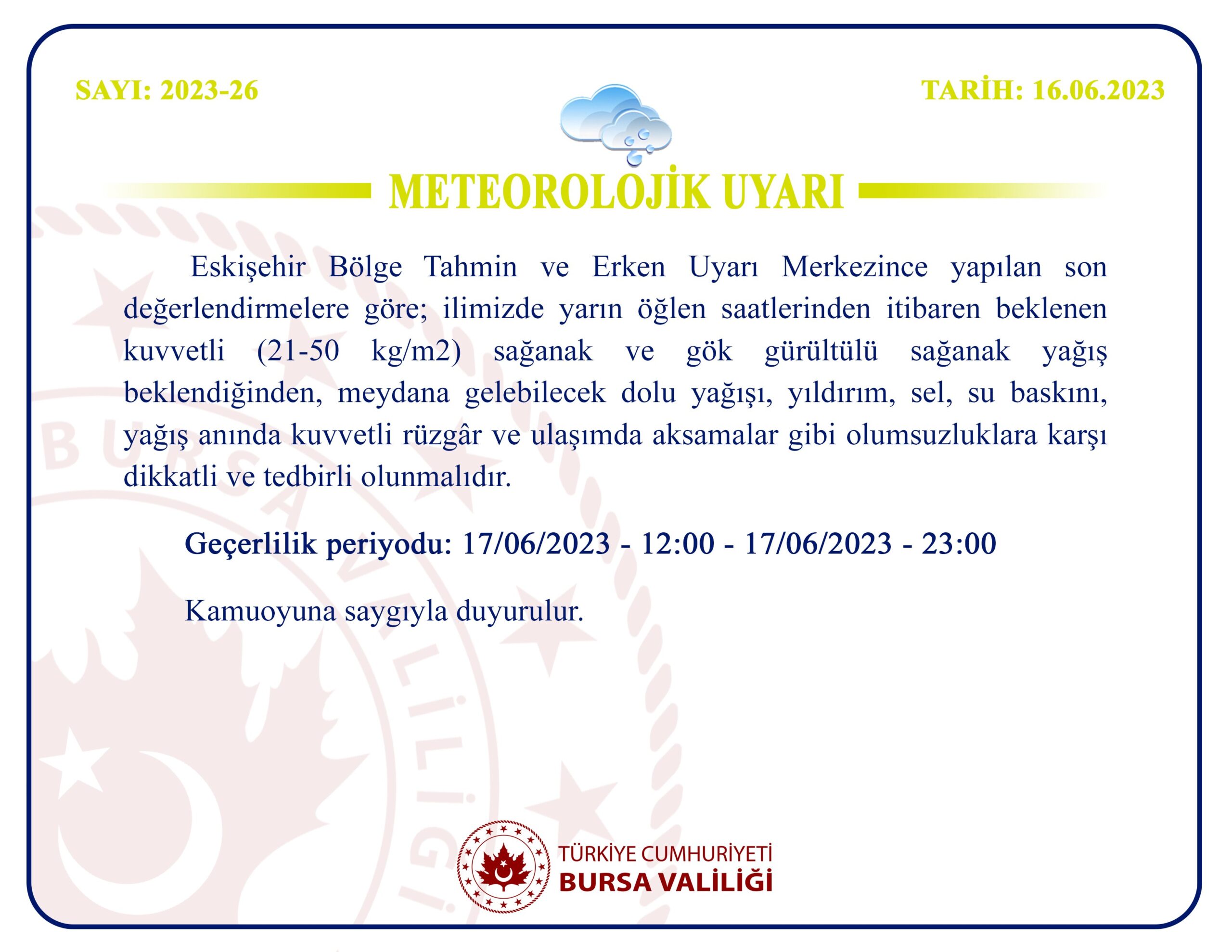 Eskişehir Bölge Tahmin ve Erken Uyarı Merkezince yapılan son değerlendirmelere göre; ilimizde yarın öğlen saatlerinden itibaren beklenen kuvvetli (21-50 kg/m2) sağanak ve gök gürültülü sağanak yağış beklendiğinden, meydana gelebilecek dolu yağışı, yıldırım, sel, su baskını, yağış anında kuvvetli rüzgâr ve ulaşımda aksamalar gibi olumsuzluklara karşı dikkatli ve tedbirli olunmalıdır.