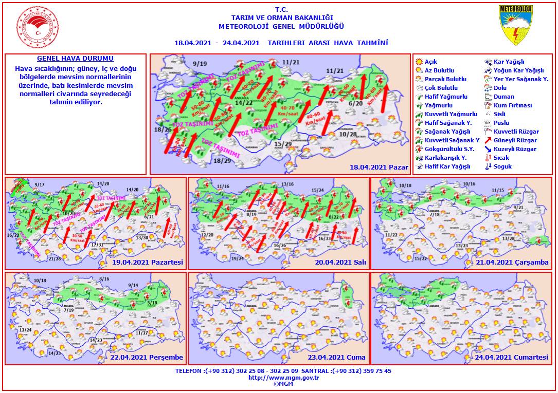 Haftalık Hava Durumu (18 – 24 Nisan 2021) Hava sıcaklıklarının güney, iç ve doğu bölgelerde mevsim normallerinin üzerinde, batı kesimlerde mevsim normalleri civarında seyredeceği tahmin ediliyor.