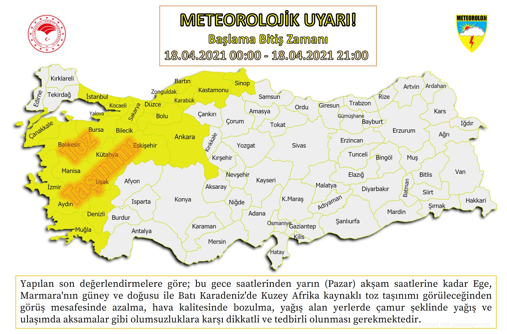Yapilan son değerlendirmelere göre; bu gece saatlerinden yarin (Pazar) aksam saatlerine kadar Ege, Marmara’nın güney ve doğusu ile Batı Karadeniz’de Kuzey Afrika kaynaklı toz taşınımı görüleceğinden görüş mesafesinde azalma, hava kalitesinde bozulma, yağış alan yerlerde çamur seklinde yağış ve ulaşımda aksamalar gibi olumsuzluklara karşı dikkatli ve tedbirli olunması gerekmektedir.
