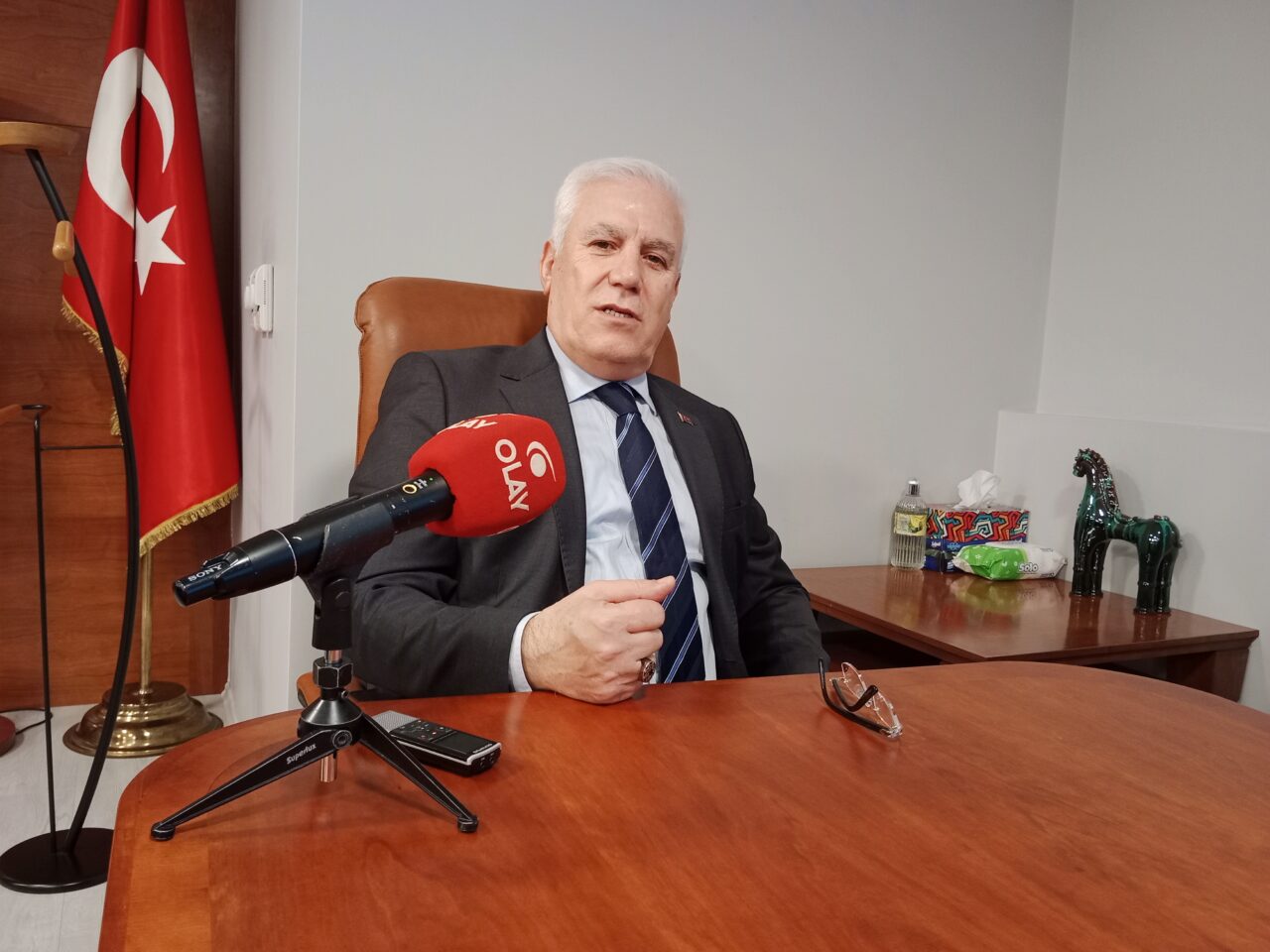 Aslında… Planlı ve ani gelişen programları nedeniyle çok yoğun günüydü. Buna karşın, Büyükşehir Belediye Başkanı Mustafa Bozbey o yoğunlukta zaman açıp Olay’ı ziyarete geldi.