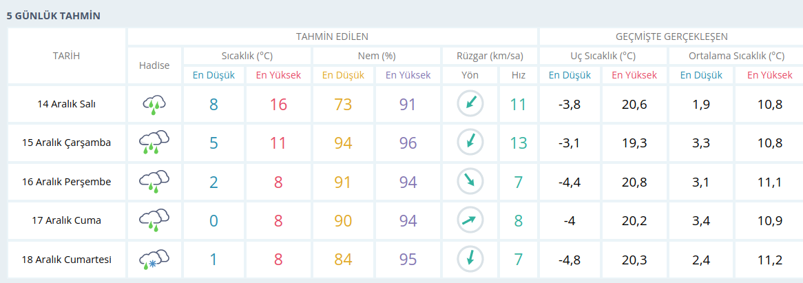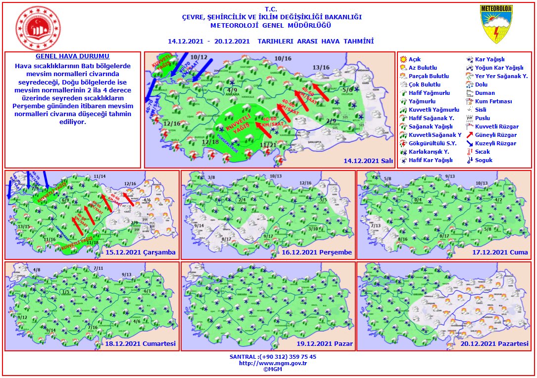 Haftalık Hava Durumu (14-20 Aralık 2021) Hava sıcaklıklarının batı bölgelerde m. normalleri civarında seyredeceği, doğu bölgelerde ise m. normallerinin 2 ila 4 derece üzerinde seyreden hava sıcaklıklarının Perşembe gününden itibaren m. normalleri civarına düşeceği tahmin ediliyor