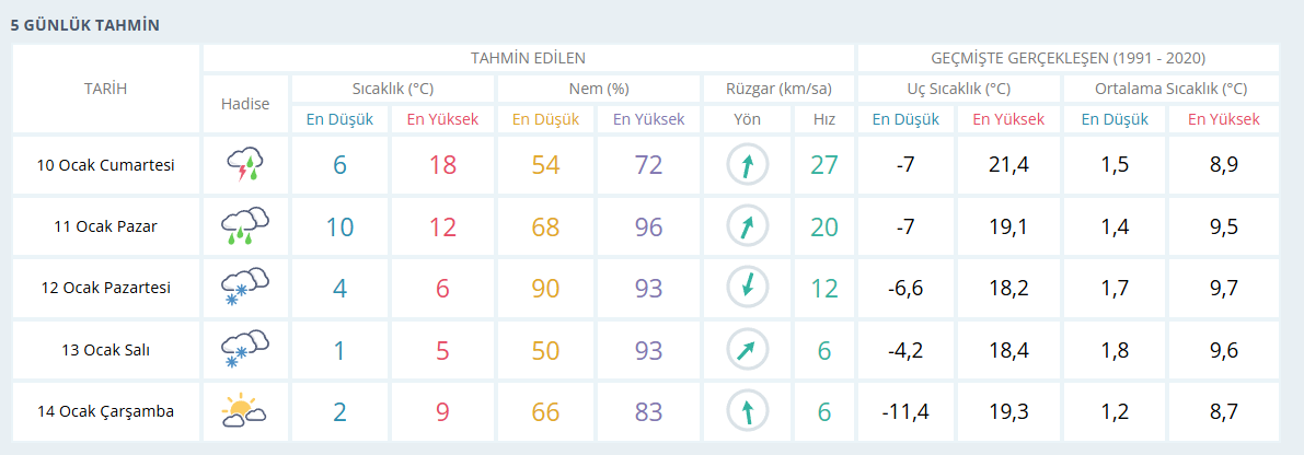 14 Ocak Çarşamba günü ise yağışların etkisini yitirmesi beklenirken, soğuk hava devam edecek. Sıcaklıklar 2 ila 9 derece arasında olacak.