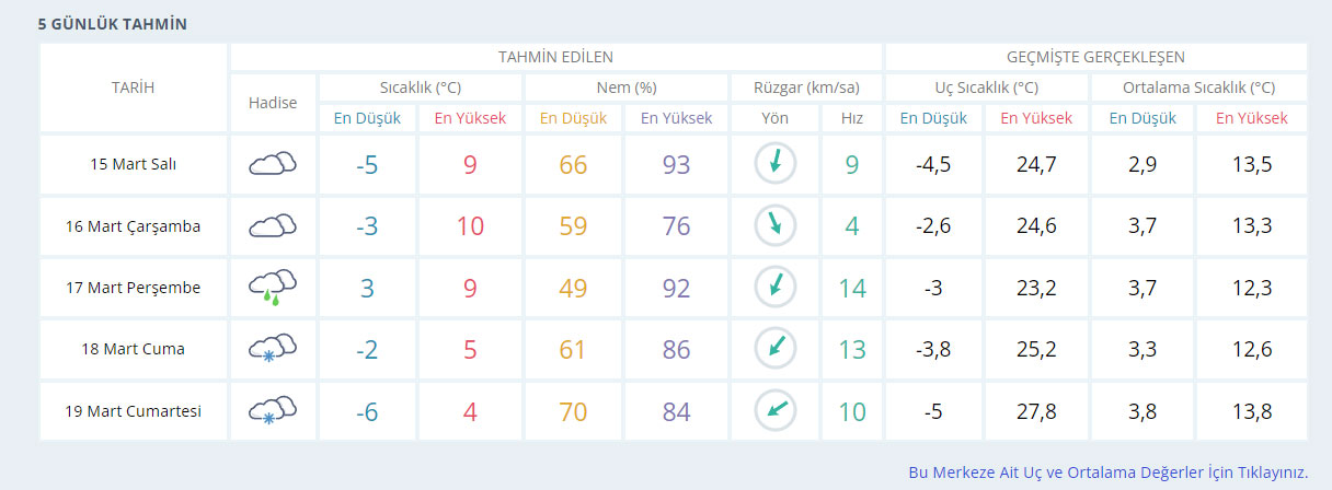 Sıcaklıklarda önemli bir değişiklik olmayacağı, ülkemiz genelinde mevsim normallerinin altında seyretmeye devam edeceği tahmin ediliyor. Rüzgar: Genellikle kuzeyli, güneydoğu kesimlerde güneyli yönlerden hafif, ara sıra orta kuvvette; Akdeniz’in iç kesimleri ile İç Anadolu’nun güney ve doğusunda kuzeyli yönlerden, kuvvetli ve kısa süreli fırtına (40-90 km/saat) şeklinde esmesi bekleniyor.
