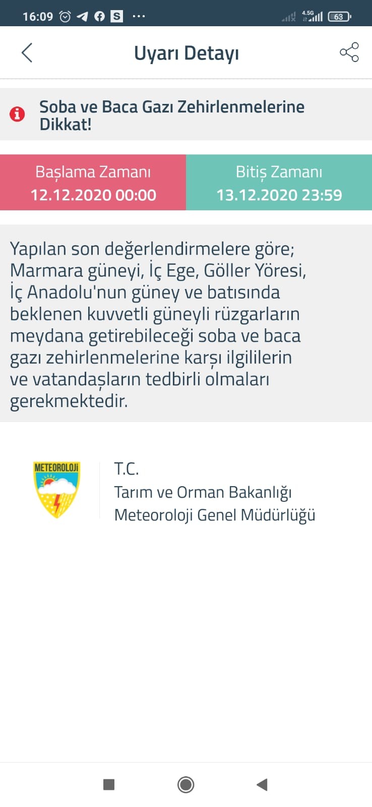 Meteoroloji Genel Müdürlüğü’nden yapılan açıklamada, “Yapılan son değerlendirmelere göre; Marmara güneyi, İç Ege, Göller Yöresi, İç Anadolu’nun güney ve batısında beklenen kuvvetli güneyli rüzgarların meydana getirebileceği soba ve baca gazı zehirlenmelerine karşı ilgililerin ve vatandaşların tedbirli olmaları gerekmektedir.” denildi.