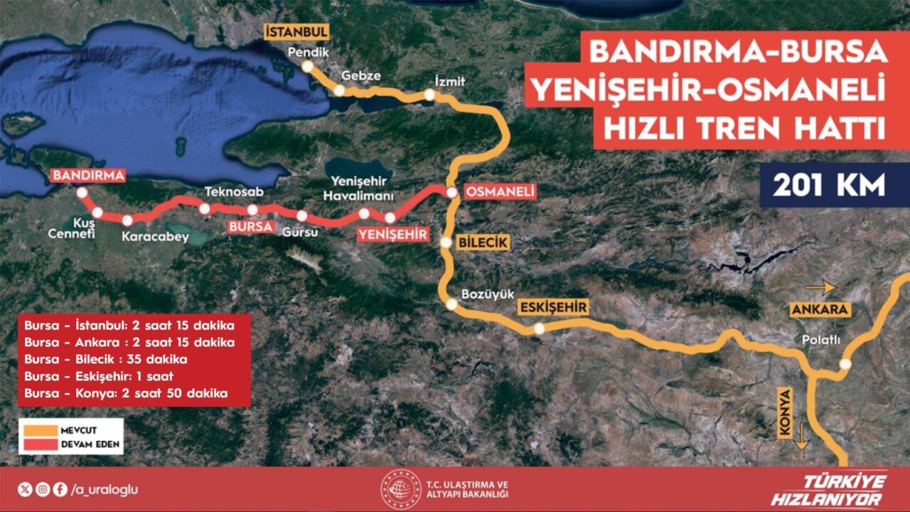 Bakan Uraloğlu’nun Osmaneli-Bursa arası yüksek hızlı tren hattının önümüzdeki yıl hizmete açılacağını, projenin tamamının ise 2028 yılı sonuna kadar bitirileceğini açıklamasına da değinen Gürkan, “Sayın Bakanımızın liderliğinde, bakanlık yetkililerimizin yoğun gayreti ile yürütülen Bursa-Ankara hızlı tren hattında seferler 2026 yılının ortasında başlayacak. Bu, kentimizin ulaşım altyapısında çok büyük bir dönüm noktası olacak” ifadelerini kullandı.